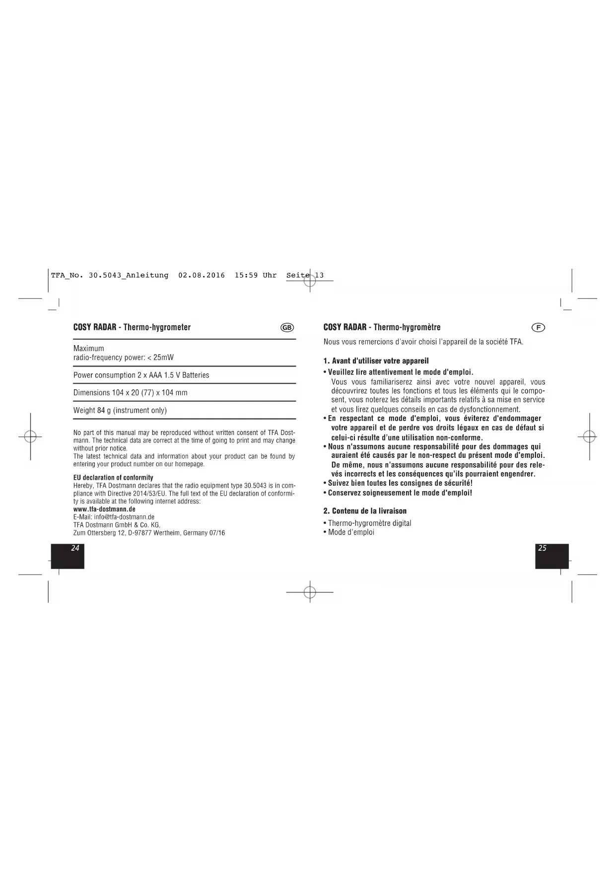 Ce produit a été fabriqué avec des matériaux de construction de haute qualité qui peuvent être recyclés et réutilisés. Les piles et accus usagés ne peuvent en aucun cas être jetés dans les ordures ménagères ! TFA_No. 30.5043_Anleitung 02.08.2016 15:59 Uhr Seite 173534 COSY RADAR - Thermo-hygromètre