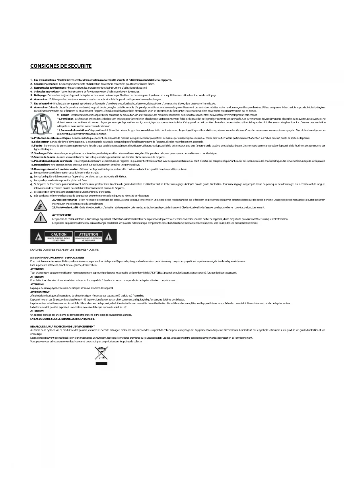 Pour maintenir une bonne ventilation, veillez à laisser un espace autour de l'appareil (à partir de plus grandes dimensions protubérantes y compris les projections) supérieure ou égale à celle indiquée ci-dessous. Face supérieure, inférieure, avant, arrière, gauche, droite : 10 cm ATTENTION Tout changement ou toute modification non expressément approuvé par la partie responsable de la conformité de KRK SYSTEMS pourrait annuler l'autorisation accordée à l'usager d'utiliser cet appareil. ATTENTION Pour éviter tout choc électrique, introduisez la lame la plus large de la fiche dans la borne correspondante de la prise et insérez complètement. ATTENTION La plaque des marquages et des caractéristiques se trouve à l'arrière de l'appareil. AVERTISSEMENT Afin de réduire les risques d'incendie ou de choc électrique, n'exposez pas cet appareil à la pluie et à l'humidité. L'appareil ne doit pas être exposé au ruissellement ni à la projection d'eau et aucun objet contenant un liquide, tel qu'un vase, ne doit être posé dessus. La prise secteur est utilisée comme dispositif de débranchement de l'appareil, elle doit rester facilement accessible durant l'utilisation. Pour débrancher complètement l'appareil du secteur, la fiche de courant doit être entièrement retirée de la prise secteur. La batterie ne doit pas être exposée à une chaleur excessive telle que rayons du soleil, feu etc. ATTENTION Un appareil protégé par une borne de terre doit être branché à une prise de courant mise à la terre. EN CAS DE DOUTE CONSULTER UN ELECTRICIEN QUALIFIE.