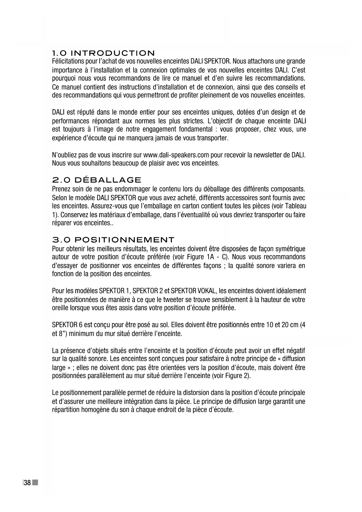 Félicitations pour l’achat de vos nouvelles enceintes DALI SPEKTOR. Nous attachons une grande importance à l’installation et la connexion optimales de vos nouvelles enceintes DALI. C’est pourquoi nous vous recommandons de lire ce manuel et d’en suivre les recommandations. Ce manuel contient des instructions d’installation et de connexion, ainsi que des conseils et des recommandations qui vous permettront de profiter pleinement de vos nouvelles enceintes. DALI est réputé dans le monde entier pour ses enceintes uniques, dotées d’un design et de performances répondant aux normes les plus strictes. L’objectif de chaque enceinte DALI est toujours à l’image de notre engagement fondamental : vous proposer, chez vous, une expérience d’écoute qui ne manquera jamais de vous transporter. N’oubliez pas de vous inscrire sur www.dali-speakers.com pour recevoir la newsletter de DALI. Nous vous souhaitons beaucoup de plaisir avec vos enceintes.