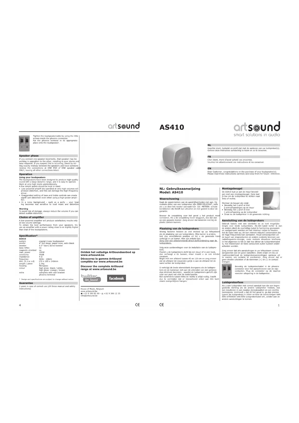 Geachte klant, bedankt en profi ciat met de aankoop van uw luidspreker(s). Gelieve deze instructies aandachtig te lezen en ze te bewaren. Cher client, merci d'avoir acheté ces enceintes. Veuillez lire attentivement ces instructions et les conserver. Dear Customer, congratulations on the purchase of your loudspeaker(s). Please read these instructions carefully and keep them for future reference. NL: Gebruiksaanwijzing Model: AS410 Waarschuwing Raak de oppervlakken van de aandrijfeenheden niet aan. De mobiele delen van een luidspreker zijn ZEER DELICAAT; zelfs als u ze door het rooster aanraakt kan dat METEEN schade berokkenen die DUUR kan uitvallen en niet gedekt is door de garantie.Bewaar de verpakking voor het geval u het product moet vervoeren. Als u de verpakking liever weggooit, doe dat dan op een gepaste manier. Zorg ervoor dat kinderen niet bij de plastic zakken kunnen. Plaatsing van de luidsprekers Weinig factoren hebben zo veel invloed op uw hifisysteem als de plaatsing van uw luidsprekers. Elke kamer is anders; test dus verschillende posities uit tot u de gewenste klank verkrijgt in uw kamer. Hier zijn enkele tips: Zorg voor een onbelemmerde direct-zichtverbinding naar de luidsprekers.Volg onze aanbevelingen voor de installatie van de luidspre-kers. Plaatst u de luidsprekers dicht bij een muur of in een hoek, dan verhoogt u de bassen, maar maakt u ze ook minder constant. Begin met een afstand tussen 45 en 120 cm en zorg ervoor dat de afstand tot zijwanden gelijk is aan de afstand tot de wand achter de luidspreker.U verkrijgt de beste stereoklank doorgaans als de luidspre-kers en de luisteraar zich aan de uiteinden van een gelijkzij-dige driehoek bevinden, waarbij de luidsprekers gericht zijn naar een punt net vóór de luisterpositie.Een symmetrie tussen links en rechts is altijd nuttig; tracht dus te vermijden dat er bijvoorbeeld enkel aan één kant zware overgordijnen hangen. Montagebeugel De AS410 kun je aan de muur bevesti-gen met een montagebeugel. Deze laat je toe om de luidspreker te richten naar links of rechts. Monteer de beugel als volgt:• Bevestig het L-profi el met 2 schroefopeningen op de muur• Bevestig het L-profi el met 1 schroefopening op de luidspreker• Draai nu de luidspreker in de gewenste richting Aansluiting van de luidsprekers Gebruik kabels met een identieke en zo kort mogelijke lengte voor beide luidsprekers. Als één kabel korter is dan de andere dient de overtollige kabel in harmonica gevouwen en vastgemaakt worden om het interieur netjes te houden. Rol de kabel niet op; dit kan immers inductie veroorzaken die de hoge frequenties kan aantasten. Houd contactpunten uit de buurt van stopcontacten en andere evidente bronnen van radiofrequentie-energie, zoals mobiele draadloze telefoons. In het algemeen is het zo dat hoe dikker de luidsprekerkabel is, hoe makkelijker de twee conductors zullen kunnen onder-scheiden worden. Zorg ervoor dat alle aansluitingen in uw hifisysteem correct aangesloten zijn en goed vastzitten. Denk eraan om bij uw routineonderhoud de luidsprekeraansluitingen opnieuw uit te voeren, om oxidatie te voorkomen. Zorg ervoor dat er geen draden uitsteken of de klemmen (+) en (-) in contact brengen.Bevestig de luidsprekerkabel in de phoenix connector door het aanschroeven van de vijs-contacten. Plug de connector op de daartoe voorzien uitsparing in de luidspreker. Luidsprekerfase Als u een luidspreker niet correct aansluit kan die een tegen- gestelde werking als de andere luidspreker hebben, wat kan resulteren in een zwakke stereokwaliteit en een slechte basrespons. Vermoedt u dat dit het geval is, ga dan precies tussen de luidsprekers in zitten en keer de aansluitingen AAN ÉÉN UITEINDE VAN ÉÉN luidsprekerkabel om, zonder aan de andere aansluitingen te komen.Tighten the loudspeakercable by using the little screws inside the phoenix connector. Put the phoenix terminal in its appropriate place onto the loudspeaker. Speaker phase If you connect one speaker incorrectly, that speaker may be working in opposition to the other, resulting in poor stereo and bass response. If you suspect this is occurring, check by sit-ting exactly midway between the speakers and have someone reverse the connections at ONE END of ONE speaker cable ONLY, leaving all other connections intact. Operation Using your loudspeakersThe loudspeakers have been designed to produce high-quality sound with a large dynamic range, and it is easy to operate them at very high levels unintentionally.A few simple points should be kept in mind:• Low-powered amplifi ers operated at very high volumes will produce distortion, and this can damage the high-frequency driver.• Exaggerated setting of bass and treble controls can create signifi cant distortion even when using a high-power ampli-fi e r .• In a noisy background – such as a party – your hear-ing becomes less sensitive to loud music and distortion.WarningTo avoid risk of damage, always reduce the volume if you can detect audible distortion. Choice of amplifi er A low-powered amplifier will produce satisfactory results only at low volume settings.To obtain the best performance from your speakers, try to use an amplifier with a power rating close to or slightly higher than that of the loudspeakers. Specifi cation* AS410system coaxial 2-way loudspeakerwoofer 4” full range, paper cone, satin blacktweeter 0.5” fabric dome tweeterbass reflex nomagnetic shielded nomax. power 100Wsensitivity 95dBimpedance 4 Ωfrequency 90Hz - 20kHzdim. (h x w x d) 170 x 165 x 140mmweight / piece 2.3kghousing fibreglasscolour high gloss: black / white, high gloss: orange / brownextra complete with wall bracket phoenix terminal* Design and specifications are subject to change without notice. Guarantee 2 years in case of correct use (cfr these manual and safety instructions)House of Music, Belgiumwww.artsound.be +32 9 380 81 80 - +32 9 386 12 35info@artsound.be2 3 AS410 AS410 Gebruik Bediening van uw luidsprekers De luidsprekers zijn o