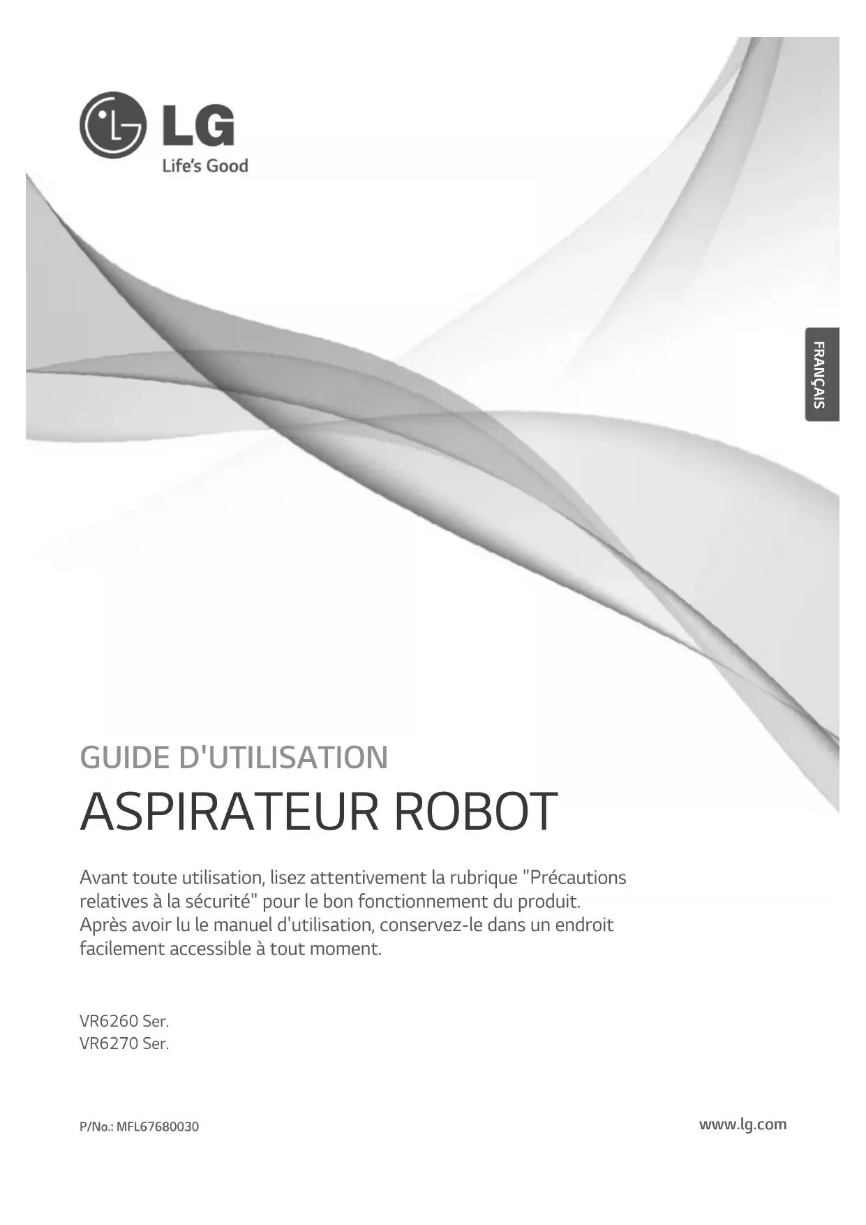 Les dessins peuvent être différents des objets réels. Filtre (Hepa11) (en option) Outil de nettoyage Brosse (sur le couvercle du bac à poussière) Support lingette microfi bre (en option) Capteurs de nettoyage Filtre de nettoyage Lingettes microfi bre (2 pieces) (en option) Piles pour la télécommande (2 piles de type AAA) Guide de prise en main rapide Manuel d'utilisation Base de chargement Aspirateur robot www.lg.comGUIDE RAPIDE ASPIRATEUR ROBOT Ce guide décrit brièvement comment utiliser l’aspirateur robot. Pour plus de détails, veuillez consulter le manuel de l’utilisateur. Veuillez lire attentivement ce qui suit avant d ‘installer et de mettre en service le produit.GUIDE D'UTILISATION ASPIRATEUR ROBOT Avant toute utilisation, lisez attentivement la rubrique "Précautions relatives à la sécurité" pour le bon fonctionnement du produit. Après avoir lu le manuel d'utilisation, conservez-le dans un endroit facilement accessible à tout moment. www.lg.com Télécommande Brosse latérale (nombre : 2) (en option) Brosse principale (en option)7 FRANÇAIS