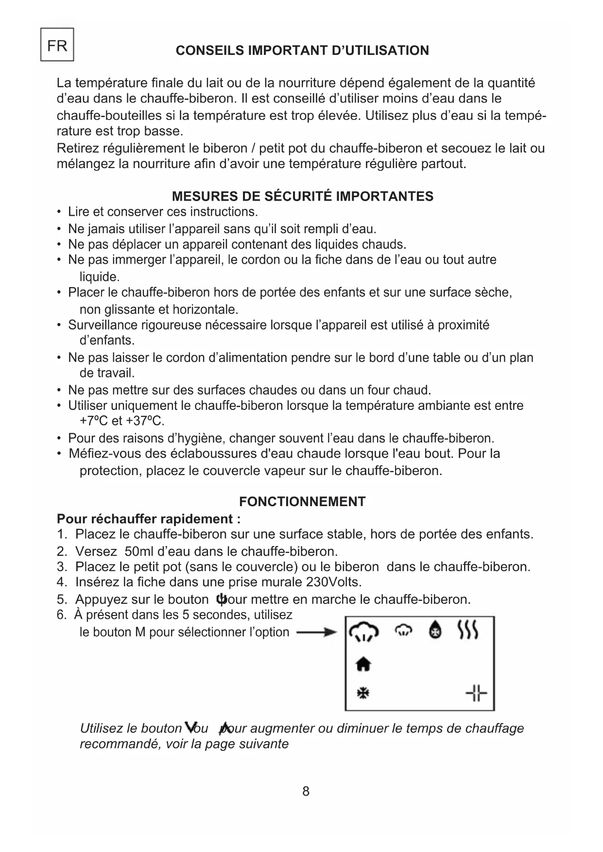 le bouton M pour sélectionner l’option Utilisez le bouton ou pour augmenter ou diminuer le temps de chauffage recommandé, voir la page suivante FR9