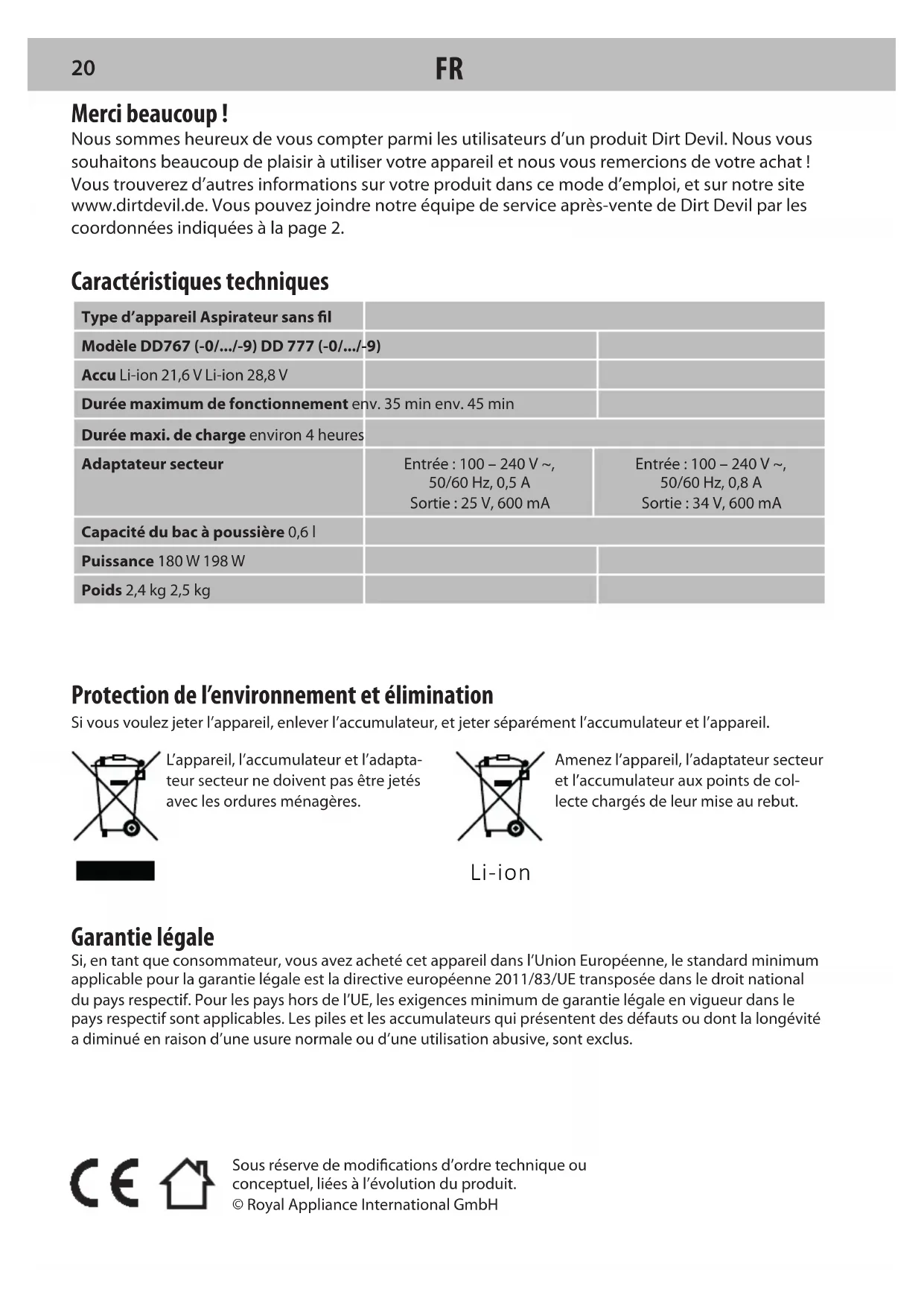 19Sous réserve de modications d’ordre technique ou conceptuel, liées à l’évolution du produit.© Royal Appliance International GmbH Merci beaucoup ! Nous sommes heureux de vous compter parmi les utilisateurs d’un produit Dirt Devil. Nous vous souhaitons beaucoup de plaisir à utiliser votre appareil et nous vous remercions de votre achat! Vous trouverez d’autres informations sur votre produit dans ce mode d’emploi, et sur notre site www.dirtdevil.de. Vous pouvez joindre notre équipe de service après-vente de Dirt Devil par les coordonnées indiquées à la page 2. Caractéristiques techniques Type d’appareil Aspirateur sans lModèle DD767 (-0/.../-9) DD 777 (-0/.../-9)Accu Li-ion 21,6 V Li-ion 28,8 VDurée maximum de fonctionnement env. 35 min env. 45 minDurée maxi. de charge environ 4 heuresAdaptateur secteurEntrée : 100 – 240 V ~, 50/60 Hz, 0,5 A Sortie : 25 V, 600 mAEntrée : 100 – 240 V ~, 50/60 Hz, 0,8 A Sortie : 34 V, 600 mACapacité du bac à poussière 0,6 lPuissance 180 W 198 WPoids 2,4 kg 2,5 kg Protection de l’environnement et élimination Si vous voulez jeter l’appareil, enlever l’accumulateur, et jeter séparément l’accumulateur et l’appareil.L’appareil, l’accumulateur et l’adapta-teur secteur ne doivent pas être jetés avec les ordures ménagères.Amenez l’appareil, l’adaptateur secteur et l’accumulateur aux points de col-lecte chargés de leur mise au rebut. Garantie légale Si, en tant que consommateur, vous avez acheté cet appareil dans l’Union Européenne, le standard minimum applicable pour la garantie légale est la directive européenne 2011/83/UE transposée dans le droit national dupays respectif. Pour les pays hors de l’UE, les exigences minimum de garantie légale en vigueur dans le pays respectif sont applicables. Les piles et les accumulateurs qui présentent des défauts ou dont la longévité a diminué en raison d’une usure normale ou d’une utilisation abusive, sont exclus. Li-ion