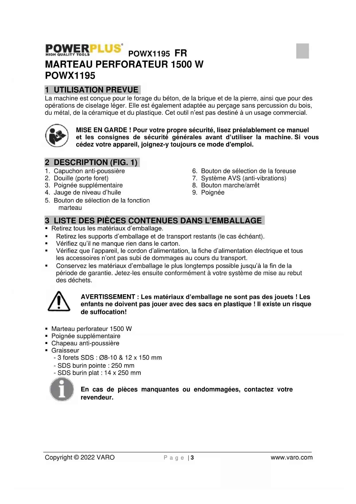 - Graisseur - 3 forets SDS : Ø8-10 & 12 x 150 mm - SDS burin pointe : 250 mm - SDS burin plat : 14 x 250 mm En cas de pièces manquantes ou endommagées, contactez votre revendeur.POWX1195 FR Copyright © 2022 VARO P a g e | 4 www.varo.com 4 PICTOGRAMMES Les symboles suivants sont utilisés dans ce mode d’emploi et/ou sur la machine :
