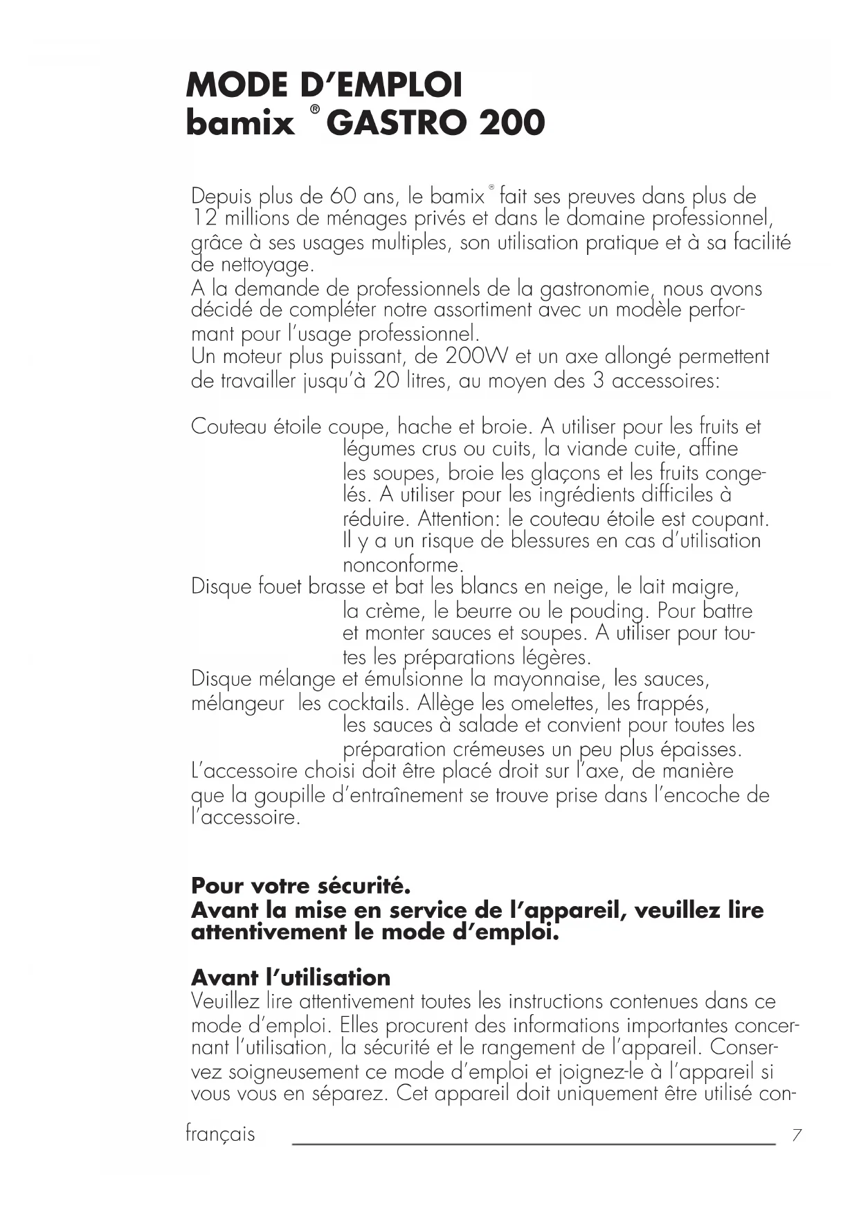 GASTRO 2008 français formément aux indications de ce mode d’emploi et dans les buts pour lesquels il a été prévu. Observez les prescriptions de sécurité Prescriptions de sécurité pour bamix