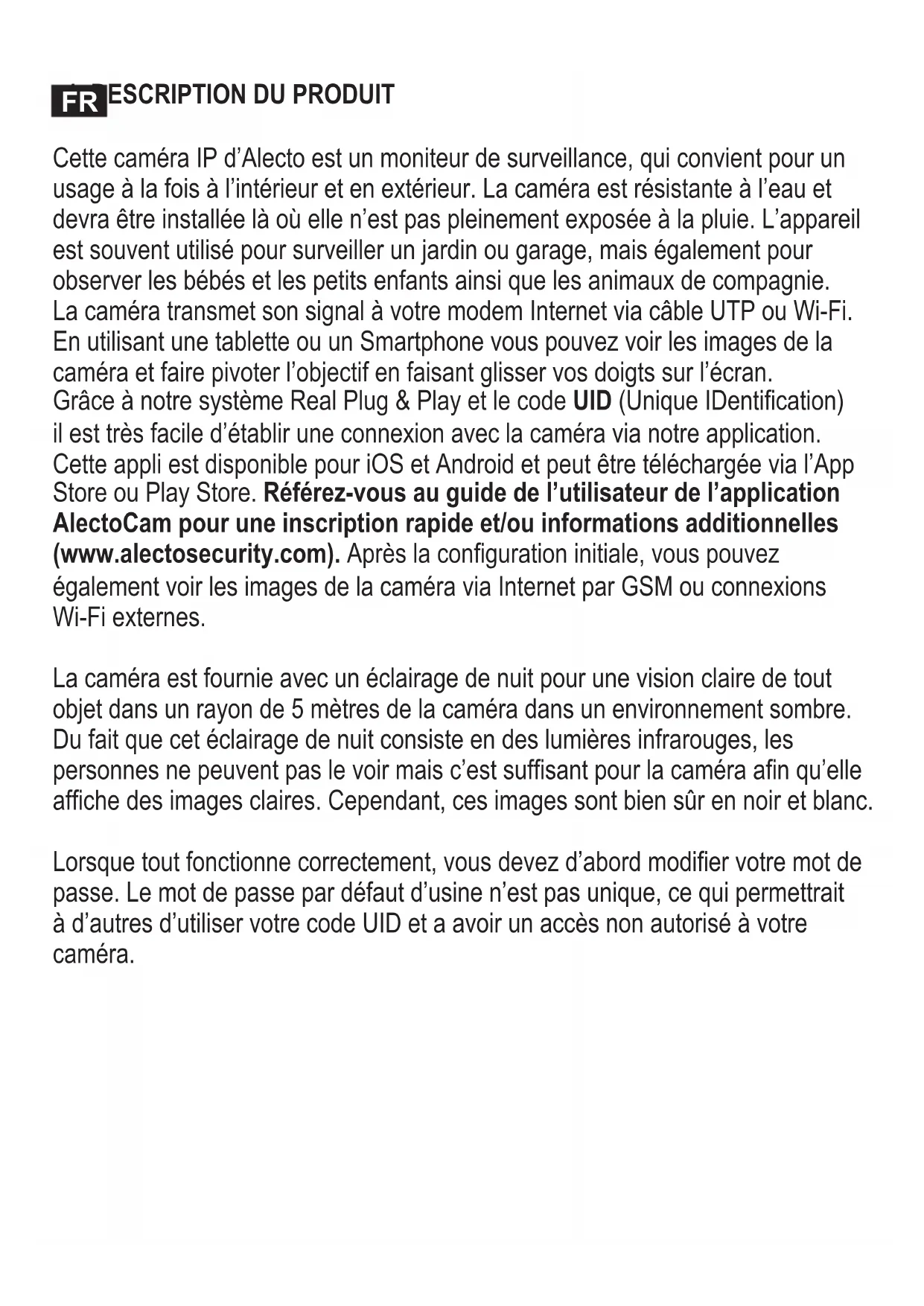 ANDROID : Allez dans le Play Store. Recherchez AlectoCam Installez l’Appli suivante : IOS : Allez dans l’App Store. Recherchez AlectoCam Installez l’Appli suivante :2.3 CONNEXION DE CAMÉRA. Utilisez le câble UTP fourni pour connecter la caméra à votre routeur Internet. Connectez la caméra à l’adaptateur (uniquement pour usage à l’intérieur) d’alimentation fourni et insérez l’adaptateur dans une prise secteur murale 230V. La caméra démarrera alors en 30 à 60 secondes. La caméra indiquera cela en en vous disant quel est le statut en anglais. Dès que la caméra est correctement enregistrée sur le routeur, lancez l’appli AlectoCAM sur votre Smartphone ou tablette. Assurez-vous que la caméra et le Smartphone ou tablette sont connecté au même réseau. Gardez à l’esprit que lors de l’utilisation d’un routeur en Wi-Fi 2.4 GHz et 5 GHz, le Smartphone ou tablette devra être enregistré sur le 2.4 GHz, sinon la caméra peut ne pas être détectée. Cette caméra fonctionne uniquement sur 2.4 GHz. Méthode 1 : Appuyez sur + sur l’écran de démarrage de l’appli AlectoCAM pour ajouter une caméra. À présent appuyez sur Rechercher LAN dans l’écran pop-up. Vous verrez alors le code UID de la caméra avec l’adresse IP. Sélectionnez ce code UID ou le bon code lorsque de multiples caméras sont connectées au réseau. L’écran Ajouter périphérique s’ouvrira. À présent entrez le mot de passe de la caméra. Le mot de passe par défaut est “admin”, appuyez sur la case à cocher OK. Veuillez modier ce mode de passe après que la caméra soit enregistrée avec succès. La caméra est enregistrée avec succès lorsque l’image apparaît. Puis allez dans les paramétrages de la caméra et sélectionnez Modier mot de passe pour attribuer un mot de passe unique à la caméra. Cela est nécessaire pour une utilisation en sécurité de votre caméra.Méthode 2 : Appuyez sur + sur l’écran de démarrage de l’appli AlectoCAM pour ajouter une caméra. Appuyez à présent sur QR Code. Le scanner du Smartphone ou de la tablette (si pris en charge) sera activé. À présent scannez le QR Code appliqué à la caméra. L’écran Ajouter périphérique s’ouvrira et ici vous pouvez entrer le mot de passé de la caméra (“admin”). Appuyez maintenant sur OK. Il peut arriver que la caméra du Smartphone ou de la tablette ne soit pas capable de lire le QR code. Dans ce cas, appuyez sur ‘Ne peut pas utiliser le QR code’ en bas de l’écran. Dans le champ UID, entrez le code UID marqué sur l’autocollant QR code et puis entrez le mot de passe “admin”. La caméra est enregistrée avec succès lorsque l’image apparaît. Puis allez dans les paramétrages de la caméra et sélectionnez Modier mot de passe pour attribuer un mot de passe unique à la caméra. Cela est nécessaire pour une utilisation en sécurité de votre caméra.