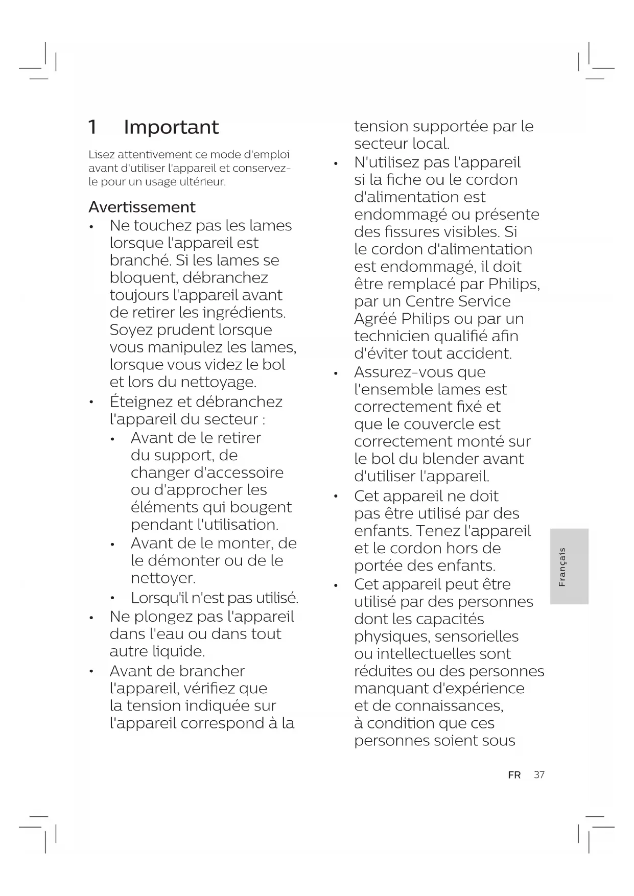 N'utilisez pas l'appareil si la che ou le cordon d'alimentation est endommagé ou présente des ssures visibles. Si le cordon d'alimentation est endommagé, il doit être remplacé par Philips, par un Centre Service Agréé Philips ou par un technicien qualié an d'éviter tout accident.