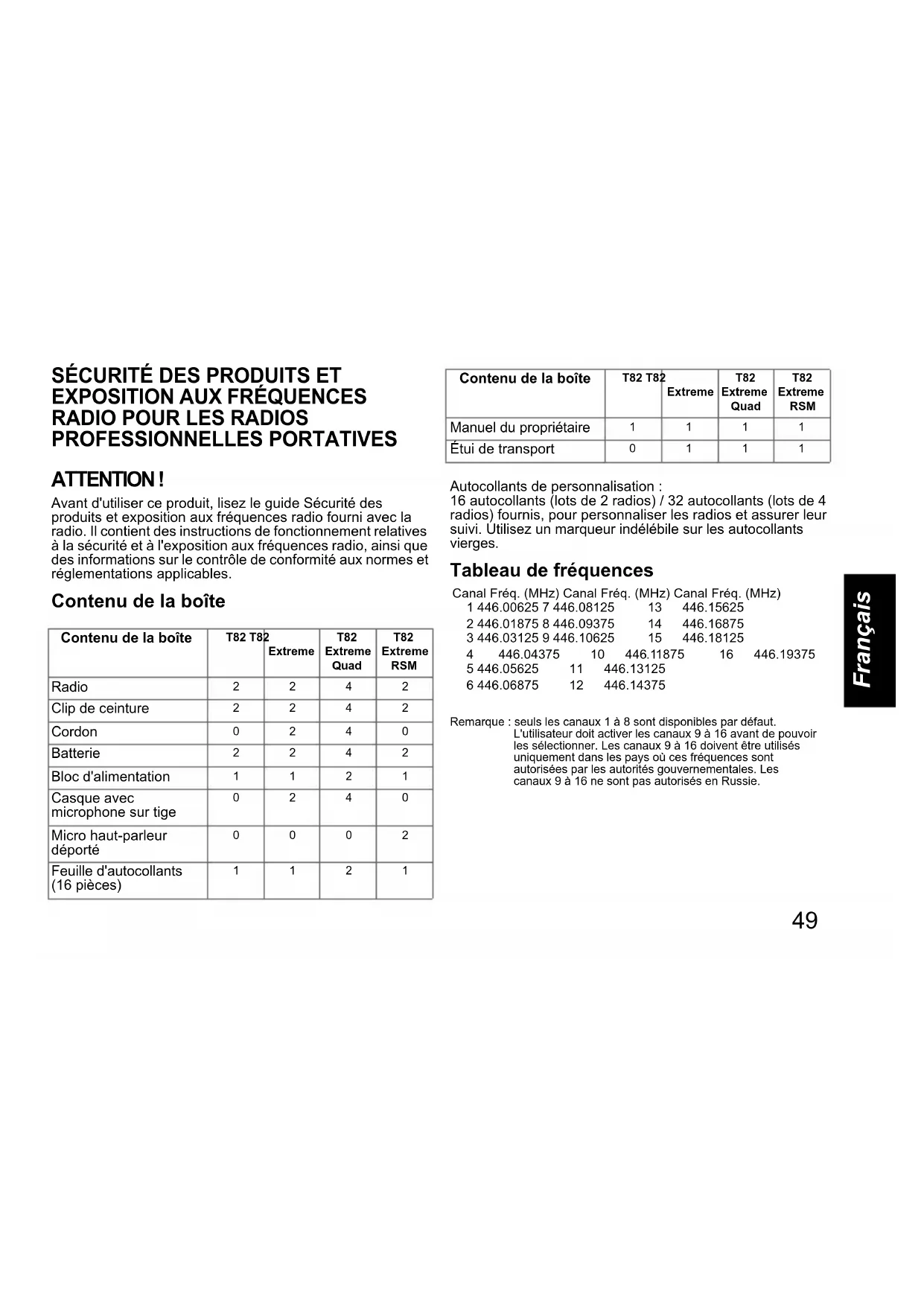 PROFESSIONNELLES PORTATIVES ATTENTION ! Avant d'utiliser ce produit, lisez le guide Sécurité des produits et exposition aux fréquences radio fourni avec la radio. Il contient des instructions de fonctionnement relatives à la sécurité et à l'exposition aux fréquences radio, ainsi que des informations sur le contrôle de conformité aux normes et réglementations applicables. Contenu de la boîte Autocollants de personnalisation : 16 autocollants (lots de 2 radios) / 32 autocollants (lots de 4 radios) fournis, pour personnaliser les radios et assurer leur suivi. Utilisez un marqueur indélébile sur les autocollants vierges. Tableau de fréquences Remarque : seuls les canaux 1 à 8 sont disponibles par défaut. L'utilisateur doit activer les canaux 9 à 16 avant de pouvoir les sélectionner. Les canaux 9 à 16 doivent être utilisés uniquement dans les pays où ces fréquences sont autorisées par les autorités gouvernementales. Les canaux 9 à 16 ne sont pas autorisés en Russie. Contenu de la boîte T82 T82 Extreme T82 Extreme Quad T82 Extreme RSM Radio