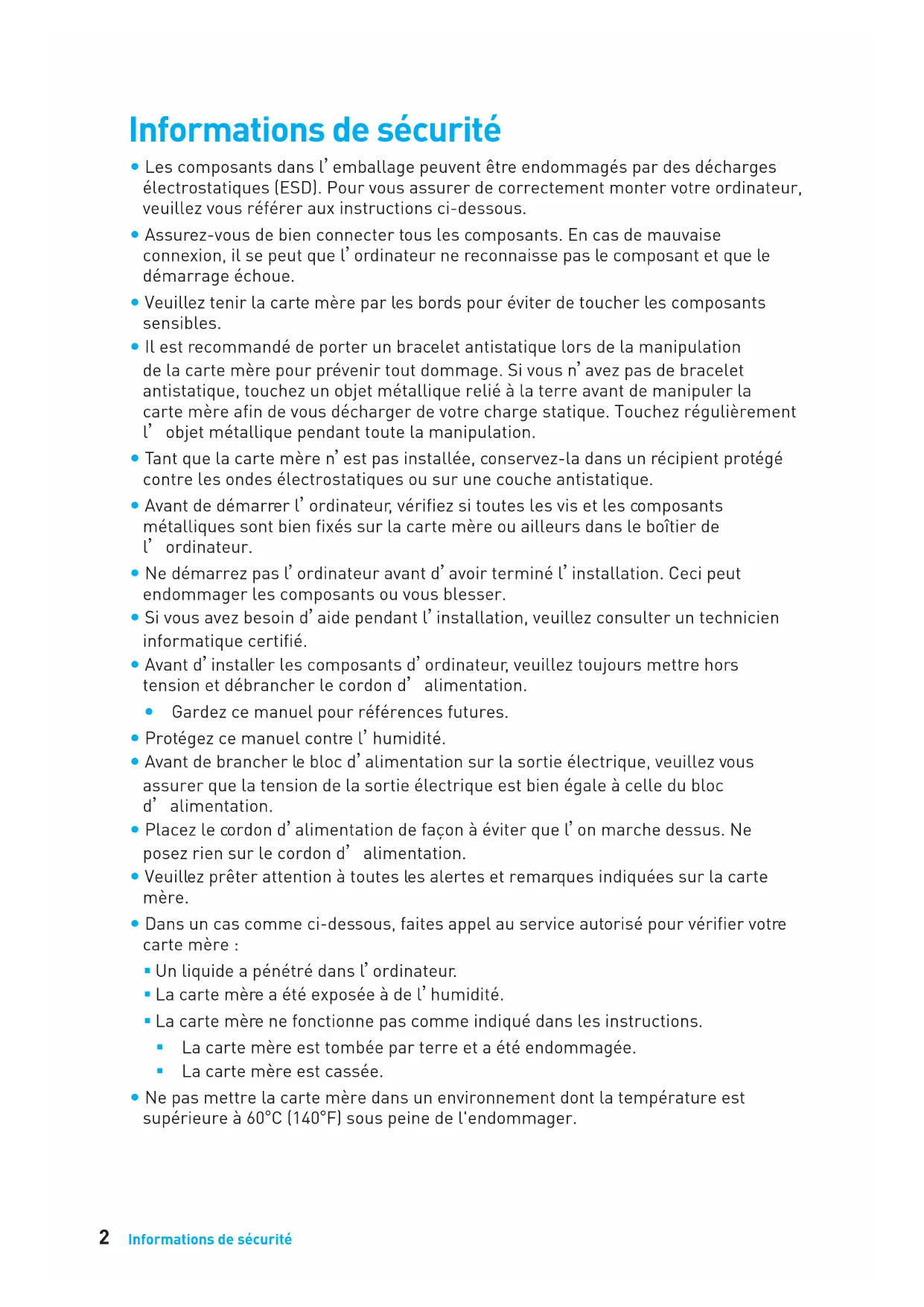 La surchauffe peut facilement endommager le processeur et la carte mère. Assurez-vous toujours que le système de refroidissement fonctionne correctement pour protéger le processeur de la surchauffe. Assurez-vous d’appliquer une couche de pâte thermique (ou adhésif thermique) entre le processeur et le système de refroidissement afin d’améliorer la dissipation de la chaleur.