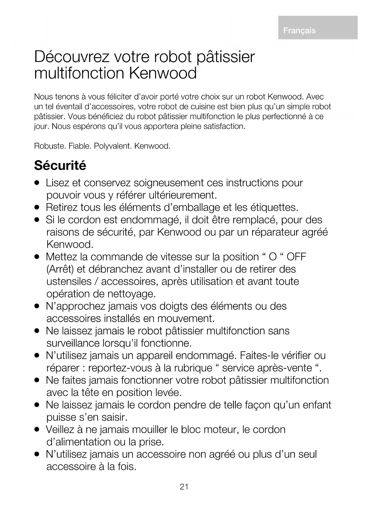 N’employez l’appareil qu’à des fins domestiques. Kenwood décline toute responsabilité dans les cas où l’appareil est utilisé incorrectement ou que les présentes instructions ne sont pas respectées. Découvrez votre robot pâtissier multifonction Kenwood Légende Sorties pour les accessoires