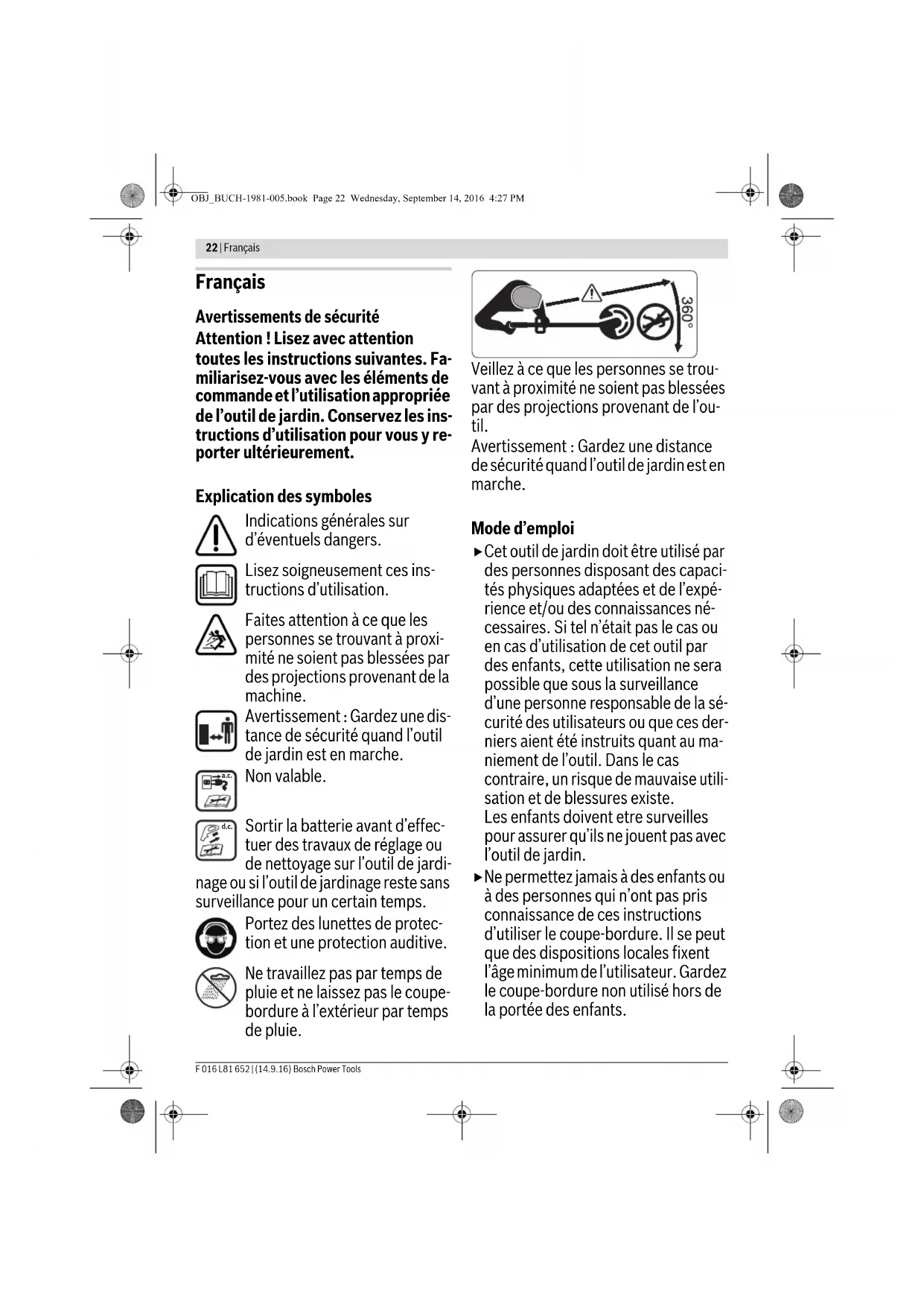 de sécurité quand l’outil de jardin est en marche. Mode d’emploi Cet outil de jardin doit être utilisé par des personnes disposant des capaci- tés physiques adaptées et de l’expé- rience et/ou des connaissances né- cessaires. Si tel n’était pas le cas ou en cas d’utilisation de cet outil par des enfants, cette utilisation ne sera possible que sous la surveillance d’une personne responsable de la sé- curité des utilisateurs ou que ces der- niers aient été instruits quant au ma- niement de l’outil. Dans le cas contraire, un risque de mauvaise utili- sation et de blessures existe. Les enfants doivent etre surveilles pour assurer qu’ils ne jouent pas avec l’outil de jardin. Ne permettez jamais à des enfants ou à des personnes qui n’ont pas pris connaissance de ces instructions d’utiliser le coupe-bordure. Il se peut que des dispositions locales fixent l’âge minimum de l’utilisateur. Gardez le coupe-bordure non utilisé hors de la portée des enfants. a.c. d.c. OBJ_BUCH-1981-005.book Page 22 Wednesday, September 14, 2016 4:27 PMFrançais | 23 Bosch Power Tools F 016 L81 652 | (14.9.16) N’utilisez jamais le coupe-bordure si les capots ou les dispositifs de pro- tection font défaut ou sont endomma- gés ou si ceux-ci ne sont pas correcte- ment positionnés. A la suite d’un choc et avant l’utilisa- tion de l’outil, contrôlez les éventuels dommages ou l’usure et, le cas échéant, faites effectuer des répara- tions. Ne pas utiliser l’outil de jardin lorsque vous êtes fatigué ou sous l’emprise de drogues, d’alcool ou de médica- ments. Portez des pantalons longs, épais, des chaussures solides et des gants. Ne portez pas de vêtements amples, bijoux, pantalons courts, sandales et ne travaillez pas nu-pied. Les utilisa- teurs portant les cheveux longs doivent les attacher derrière la tête pour éviter qu’ils ne soient happés par des pièces en rotation. Portez des lunettes de protection et une protection auditive si vous travaillez avec l’outil de jardin. Veillez à toujours garder une position stable et un bon équilibre. Ne pas su- restimer vos capacités. N’utilisez jamais le coupe-bordure lorsque des personnes, en particulier des enfants ou des animaux domes- tiques, se trouvent à proximité. L’opérateur ou l’utilisateur de la ton- deuse est responsable des accidents et des dommages causés à autrui ou à ses biens. Attendez l’arrêt total de la lame en ro- tation avant de la toucher. Après la mise hors tension du moteur, la lame continue à tourner, pouvant provo- quer ainsi des blessures. Ne travaillez que de jour ou sous un bon éclairage artificiel. Ne pas travailler avec le coupe-bor- dure dans des conditions météorolo- giques défavorables et plus particu- lièrement en cas d’approche d’orage. Utiliser le coupe-bordure en pré- sence d’herbe humide réduit sa per- formance. Arrêtez le coupe-bordure pour le dé- placer entre deux surfaces à tailler. Ne mettre en fonctionnement l’outil de jardin que lorsque les mains et pieds de l’utilisateur se trouvent à une distance suffisante des lames. Tenez vos mains et pieds éloignés des éléments de coupe en rotation. Retirer l’accumulateur avant de chan- ger la lame. N’utilisez jamais d’éléments de coupe métalliques pour ce coupe-bordure. Contrôlez et entretenez régulière- ment le coupe-bordure. Ne faites réparer le coupe-bordure que par des stations de Service Après-Vente autorisées. Assurez-vous toujours que les fentes de ventilation ne sont pas bouchées par des herbes. Retirer l’accumulateur : – lorsque l’outil de jardin est laissé sans surveillance – avant de changer la lame – avant de le nettoyer ou lorsque des travaux doivent être effectués sur le coupe-bordure OBJ_BUCH-1981-005.book Page 23 Wednesday, September 14, 2016 4:27 PM24 | Français F 016 L81 652 | (14.9.16) Bosch Power Tools Rangez l’outil de jardin dans un en- droit sec et sûr, et hors de portée des enfants. Ne posez pas d’autres objets sur l’outil de jardin. Pour des raisons de sécurité, rempla- cez les pièces usées ou endomma- gées. Veillez à ce que les pièces de re- change soient des pièces d’origine Bosch. Ne jamais mettre l’outil de jardin en marche sans que les accessoires correspondants soient montés. Indications pour le maniement opti- mal de l’accu Vérifier que l’outil de jardin est ef- fectivement en position d’arrêt avant de monter l’accumulateur. Le fait de monter un accumulateur dans un outil de jardin en position de fonc- tionnement peut causer des acci- dents. N’utiliser l’outil de jardin qu’avec des accumulateurs Bosch spécifi- quement désignés. L’utilisation de tout autre accumulateur peut entraî- ner des blessures et des risques d’in- cendie. Ne pas ouvrir l’accu. Risque de court-circuit. Protéger l’accu de toute source de chaleur, comme p. ex. l’exposition directe au soleil, au feu, à l’eau et à l’hu- midité. Il y a risque d’explosion. Tenez l’accumulateur non utilisé à l’écart de toutes sortes d’objets métalliques tels qu’agrafes, pièces de monnaie, clés, clous, vis ou autres, étant donné qu’un pontage peut provoquer un court-circuit. Un court-circuit entre les contacts d’ac- cu peut provoquer des brûlures ou un incendie. En cas d’endommagement et d’uti- lisation non conforme de l’accu, des vapeurs peuvent s’échapper. Ventiler le lieu de travail et, en cas de malaises, consulter un médecin. Les vapeurs peuvent entraîner des ir- ritations des voies respiratoires. N’utilisez l’accumulateur qu’avec votre produit Bosch. Ceci protège l’accumulateur contre une surcharge dangereuse. Les objets pointus comme un clou ou un tournevis et le fait d’exercer une force extérieure sur le boîtier risque d’endommager l’accu. Il peut en résulter un court-circuit interne et l’accu risque de s’enflammer, de dé- gager des fumées, d’explos
