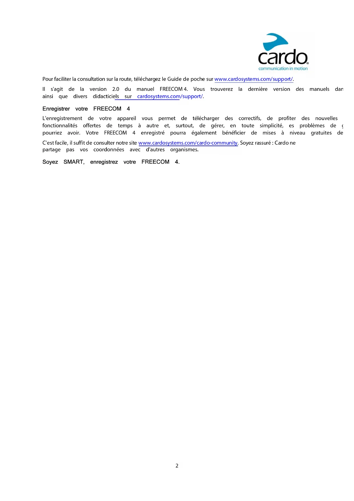 TECHNOLOGIE HAUTE PUISSANCEPour faciliter la consultation sur la route, téléchargez le Guide de poche sur www.cardosystems.com/support/. Il s'agit de la version 2.0 du manuel FREECOM4. Vous trouverez la dernière version des manuels dans votre langue ainsi que divers didacticiels sur cardosystems.com/support/. Enregistrer votre FREECOM 4 L'enregistrement de votre appareil vous permet de télécharger des correctifs, de profiter des nouvelles fonctionnalités offertes de temps à autre et, surtout, de gérer, en toute simplicité, es problèmes de garantie que vous pourriez avoir. Votre FREECOM 4 enregistré pourra également bénéficier de mises à niveau gratuites de produits. C'est facile, il suffit de consulter notre site www.cardosystems.com/cardo-community. Soyez rassuré: Cardo ne partage pas vos coordonnées avec d'autres organismes. Soyez SMART, enregistrez votre FREECOM 4.