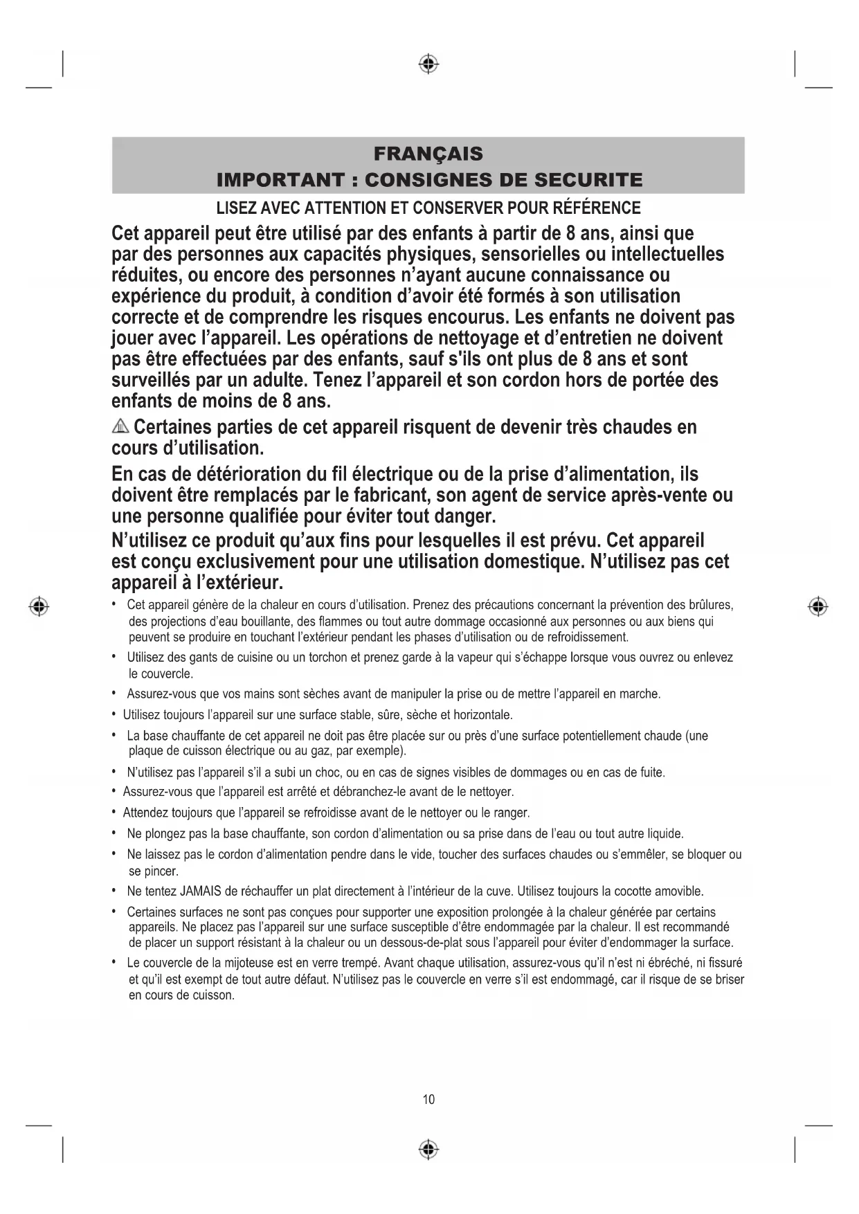 LISEZ AVEC ATTENTION ET CONSERVER POUR RÉFÉRENCE Cet appareil peut être utilisé par des enfants à partir de 8 ans, ainsi que par des personnes aux capacités physiques, sensorielles ou intellectuelles réduites, ou encore des personnes n’ayant aucune connaissance ou expérience du produit, à condition d’avoir été formés à son utilisation correcte et de comprendre les risques encourus. Les enfants ne doivent pas jouer avec l’appareil. Les opérations de nettoyage et d’entretien ne doivent pas être effectuées par des enfants, sauf s'ils ont plus de 8 ans et sont surveillés par un adulte. Tenez l’appareil et son cordon hors de portée des enfants de moins de 8 ans. Certaines parties de cet appareil risquent de devenir très chaudes en cours d’utilisation. En cas de détérioration du fil électrique ou de la prise d’alimentation, ils doivent être remplacés par le fabricant, son agent de service après-vente ou une personne qualifiée pour éviter tout danger. N’utilisez ce produit qu’aux fins pour lesquelles il est prévu. Cet appareil est conçu exclusivement pour une utilisation domestique. N’utilisez pas cet appareil à l’extérieur.