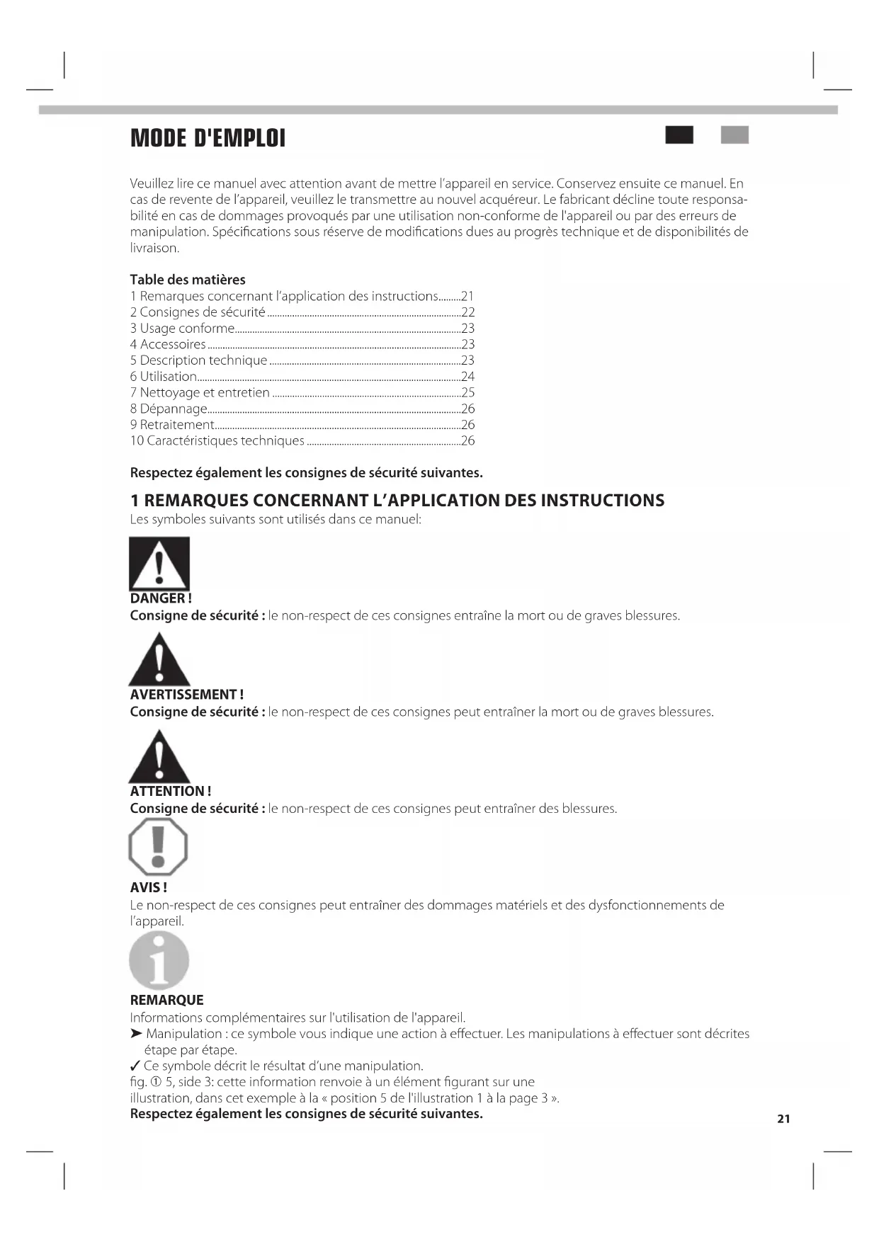 - MODE D'EMPLOI Veuillez lire ce manuel avec attention avant de mettre l’appareil en service. Conservez ensuite ce manuel. En cas de revente de l’appareil, veuillez le transmettre au nouvel acquéreur. Le fabricant décline toute responsa- bilité en cas de dommages provoqués par une utilisation non-conforme de l'appareil ou par des erreurs de manipulation. Spécifications sous réserve de modifications dues au progrès technique et de disponibilités de livraison. Table des matières 1 Remarques concernant l’application des instructions p. 21