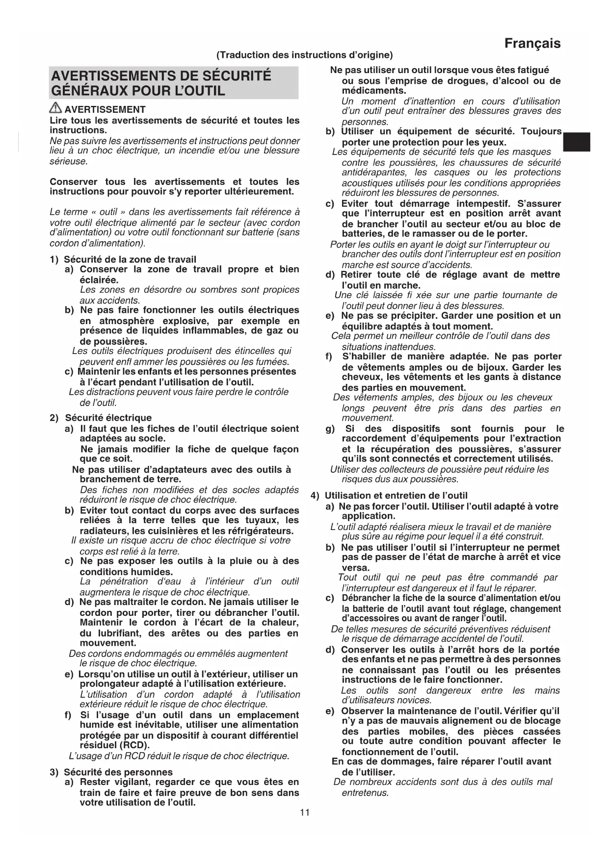 AVERTISSEMENT Lire tous les avertissements de sécurité et toutes les instructions. Ne pas suivre les avertissements et instructions peut donner lieu à un choc électrique, un incendie et/ou une blessure sérieuse. Conserver tous les avertissements et toutes les instructions pour pouvoir s'y reporter ultérieurement. Le terme « outil » dans les avertissements fait référence à votre outil électrique alimenté par le secteur (avec cordon d’alimentation) ou votre outil fonctionnant sur batterie (sans cordon d’alimentation).