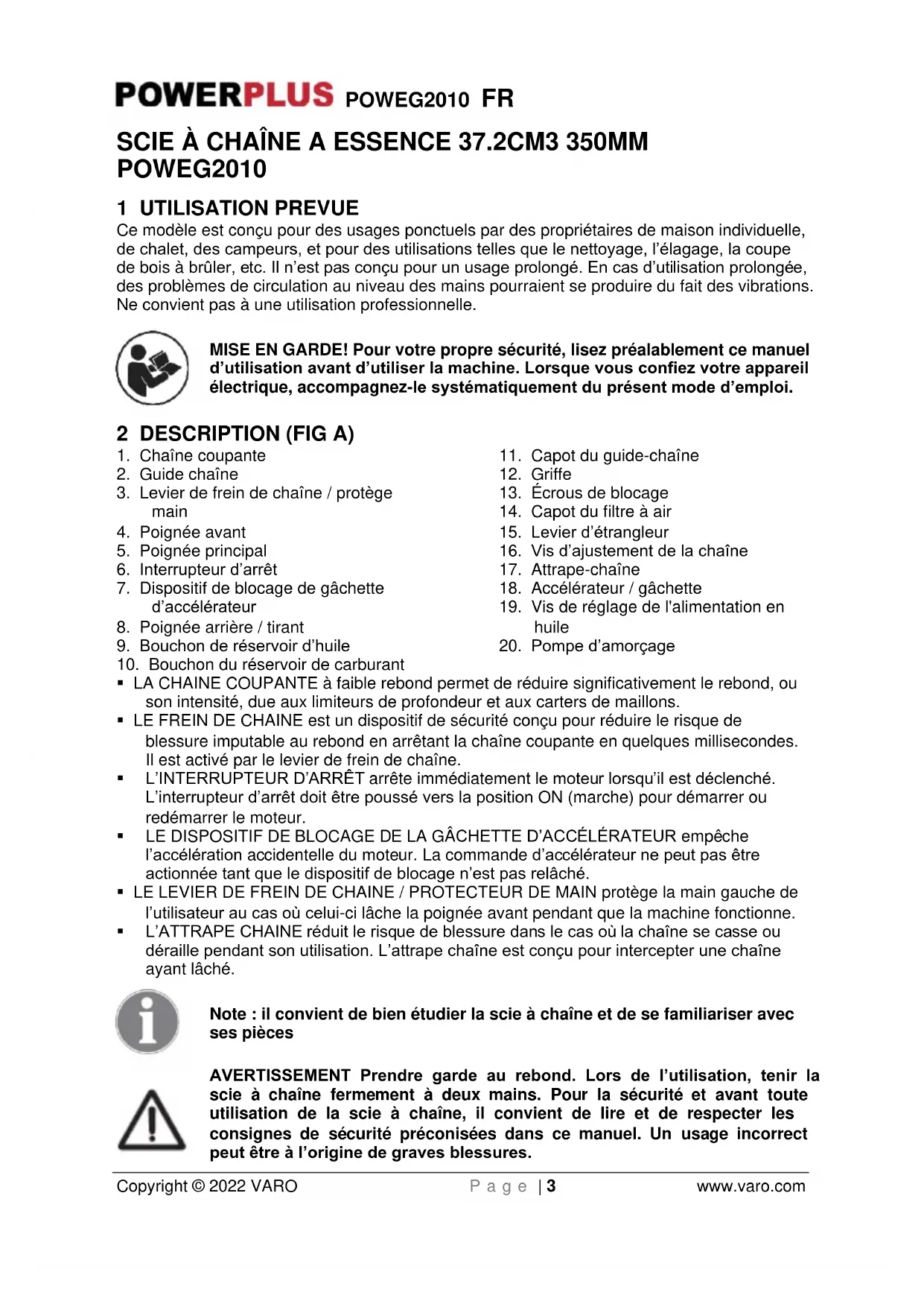 Copyright © 2022 VARO P a g e | 3 www.varo.com SCIE À CHAÎNE A ESSENCE 37.2CM3 350MM POWEG2010 1 UTILISATION PREVUE Ce modèle est conçu pour des usages ponctuels par des propriétaires de maison individuelle, de chalet, des campeurs, et pour des utilisations telles que le nettoyage, l’élagage, la coupe de bois à brûler, etc. Il n’est pas conçu pour un usage prolongé. En cas d’utilisation prolongée, des problèmes de circulation au niveau des mains pourraient se produire du fait des vibrations. Ne convient pas à une utilisation professionnelle. MISE EN GARDE! Pour votre propre sécurité, lisez préalablement ce manuel d’utilisation avant d’utiliser la machine. Lorsque vous confiez votre appareil électrique, accompagnez-le systématiquement du présent mode d’emploi. 2 DESCRIPTION (FIG A)
