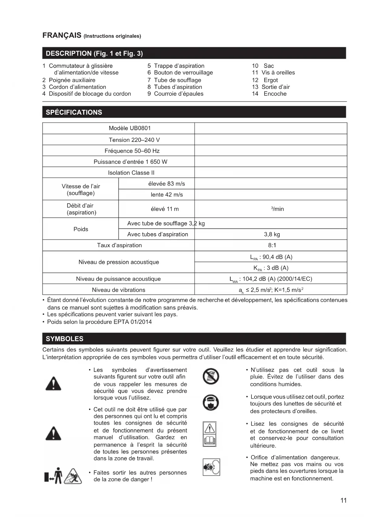 - Cét outil est prévu pour le soufflage et l'aspiration. N'utilisez jamais l'outil à des fins autres que celles prévues, par exemple le gonflage de ballons.
