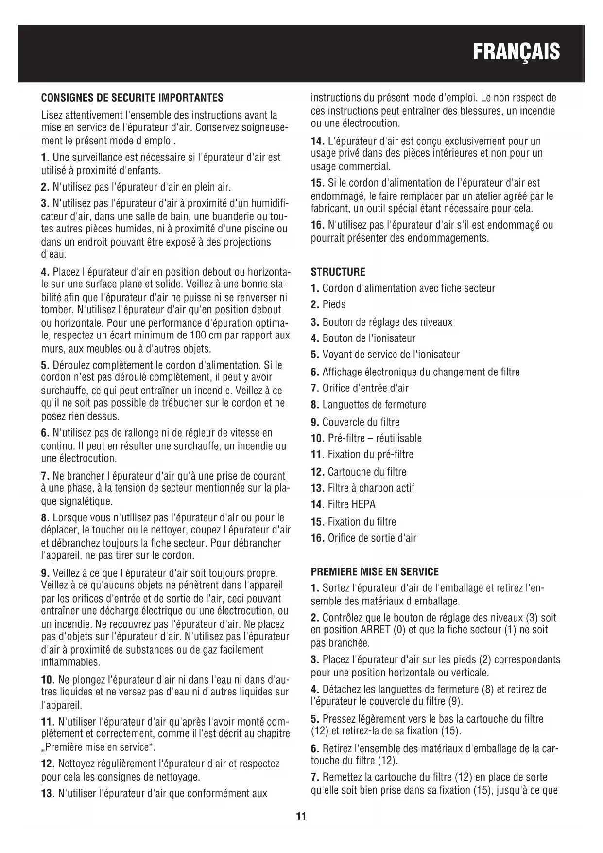 Lisez attentivement l'ensemble des instructions avant la mise en service de l'épurateur d'air. Conservez soigneuse- ment le présent mode d'emploi.