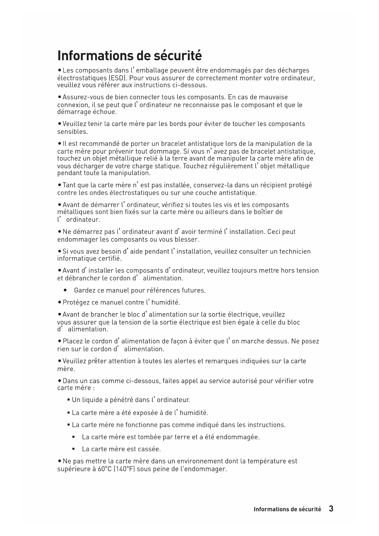 - OC Menu (menu overclocking) Informations de sécurité Informations de sécurité y Les composants dans l’emballage peuvent être endommagés par des décharges électrostatiques (ESD). Pour vous assurer de correctement monter votre ordinateur, veuillez vous référer aux instructions ci-dessous. y Assurez-vous de bien connecter tous les composants. En cas de mauvaise connexion, il se peut que l’ordinateur ne reconnaisse pas le composant et que le démarrage échoue. y Veuillez tenir la carte mère par les bords pour éviter de toucher les composants sensibles. y Il est recommandé de porter un bracelet antistatique lors de la manipulation de la carte mère pour prévenir tout dommage. Si vous n’avez pas de bracelet antistatique, touchez un objet métallique relié à la terre avant de manipuler la carte mère afin de vous décharger de votre charge statique. Touchez régulièrement l’objet métallique pendant toute la manipulation. y Tant que la carte mère n’est pas installée, conservez-la dans un récipient protégé contre les ondes électrostatiques ou sur une couche antistatique. y Avant de démarrer l’ordinateur, vérifiez si toutes les vis et les composants métalliques sont bien fixés sur la carte mère ou ailleurs dans le boîtier de l’ordinateur. y Ne démarrez pas l’ordinateur avant d’avoir terminé l’installation. Ceci peut endommager les composants ou vous blesser. y Si vous avez besoin d’aide pendant l’installation, veuillez consulter un technicien informatique certifié. y Avant d’installer les composants d’ordinateur, veuillez toujours mettre hors tension et débrancher le cordon d’alimentation. y Gardez ce manuel pour références futures. y Protégez ce manuel contre l’humidité. y Avant de brancher le bloc d’alimentation sur la sortie électrique, veuillez vous assurer que la tension de la sortie électrique est bien égale à celle du bloc d’alimentation. y Placez le cordon d’alimentation de façon à éviter que l’on marche dessus. Ne posez rien sur le cordon d’alimentation. y Veuillez prêter attention à toutes les alertes et remarques indiquées sur la carte mère. y Dans un cas comme ci-dessous, faites appel au service autorisé pour vérifier votre carte mère : Un liquide a pénétré dans l’ordinateur. La carte mère a été exposée à de l’humidité. La carte mère ne fonctionne pas comme indiqué dans les instructions. La carte mère est tombée par terre et a été endommagée. La carte mère est cassée. y Ne pas mettre la carte mère dans un environnement dont la température est supérieure à 60°C (140°F) sous peine de l'endommager.4 Spécifications Spécifications CPU Support des processeurs de la famille de série 9000 Intel® Core™/ 8ème Gen Intel p. 603