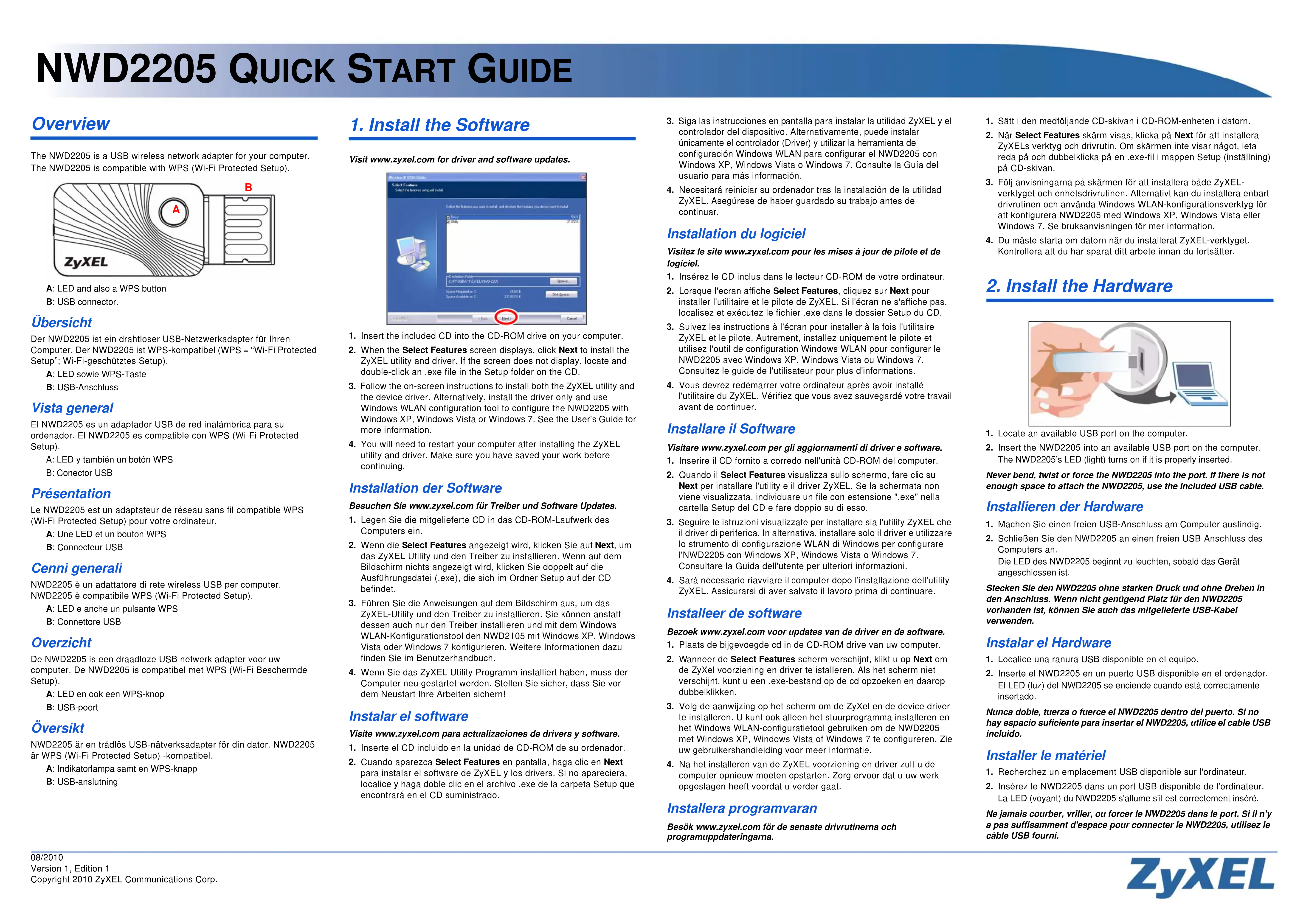 ZyXEL et le pilote. Autrement, installez uniquement le pilote et utilisez l'outil de configuration Windows WLAN pour configurer le NWD2205 avec Windows XP, Windows Vista ou Windows 7. Consultez le guide de l'utilisateur pour plus d'informations.4. Vous devrez redémarrer votre ordinateur après avoir installé l'utilitaire du ZyXEL. Vérifiez que vous avez sauvegardé votre travail avant de continuer. Installare il Software Visitare www.zyxel.com per gli aggiornamenti di driver e software.1. Inserire il CD fornito a corredo nell'unità CD-ROM del computer.
