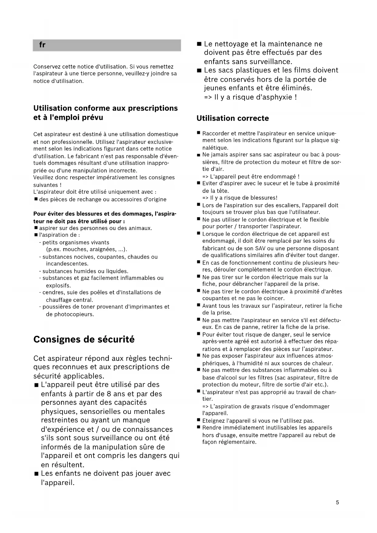 ! Bitte beachten Die Netzsteckdose muss über eine Sicherung von mindestens 16A abgesichert sein. Sollte die Sicherung beim Einschalten des Gerätes einmal ausgelöst werden, so kann dies daran liegen, dass gleichzeitig andere Elektrogeräte mit hohem Anschlusswert am gleichen Stromkreis angeschlos- sen sind. Das Auslösen der Sicherung ist vermeidbar, indem Sie vor dem Einschalten des Gerätes die niedrigste Leistungsstufe einstellen und erst danach eine höhe- re Leistungsstufe wählen. Hinweise zur Entsorgung Verpackung Die Verpackung schützt den Staubsauger vor Beschädigung auf dem Transport. Sie besteht aus umweltfreundlichen Materialien und ist deshalb recy- celbar. Entsorgen Sie nicht mehr benötigte Verpackungsmaterialien an den Sammelstellen für das Verwertungssystem »Grüner Punkt«. Altgerät Altgeräte enthalten vielfach noch wertvolle Materialien. Geben Sie deshalb Ihr ausgedientes Gerät bei Ihrem Händler bzw. einem Recyclingcenter zur Wiederverwertung ab. Aktuelle Entsorgungswege erfragen Sie bitte bei Ihrem Händler oder Ihrer Gemeindeverwaltung. Entsorgung Filter und Filterbeutel Filter und Filterbeutel sind aus umweltverträglichen Materialien hergestellt. Sofern sie keine Substanzen enthalten, die für den Hausmüll verboten sind, kön- nen sie über den normalen Hausmüll entsorgt wer- den.4 Disposal information Packaging The packaging is designed to protect the vacuum cleaner from being damaged during transportation. It is made of environmentally friendly materials and can therefore be recycled. Dispose of packaging that is no longer required at an appropriate recycling point. Old appliance Old appliances still contain many valuable materials. Therefore, please take appliances that have reached the end of their service life to your retailer or recyc- ling centre so that they can be recycled. For current disposal methods, please enquire at a retailer or your local council. Disposal of filters and dust bags Filters and dust bags are manufactured from envi- ronmentally friendly materials. Provided they do not contain substances that are not permitted in house- hold waste, you can dispose of them with your nor- mal household waste. Proper use Only connect and use the vacuum cleaner in accor- dance with the specifications on the rating plate. Never vacuum without the dust bag or dust contai- ner, motor protection or exhaust filter. => This may damage the vacuum cleaner. Do not vacuum close to the head when using a nozz- le and tube. => This could cause injury! When vacuuming stairs, the appliance must always be positioned below the user. Do not use the power cord or the hose to carry or transport the vacuum cleaner. For safety reasons, if this appliance's mains power cable becomes damaged, it must be replaced by the manufacturer, their after-sales service department or a similarlyqualified person. Fully extend the power cord when using the vacuum cleaner continuously for several hours. When disconnecting the appliance from the mains, pull on the plug itself to remove it; do not pull on the power cord. Do not pull the power cord over sharp edges or allow it to be-come trapped. Pull out the mains plug before carrying out any work on the vacuum cleaner. Do not operate the vacuum cleaner if it is damaged. Unplug the appliance from the mains if a fault is detected. For safety reasons, only authorised after-sales service personnel are permitted to carry out repairs and fit replacement parts to the vacuum cleaner. Protect the vacuum cleaner from the weather, moisture and sources of heat. Do not pour flammable substances or substances containing alcohol onto the filters (dust bag, motor protection filter, exhaust filter, etc.). The vacuum cleaner is not suitable for use on construction sites. => Vacuuming up building rubble could damage the appliance. Switch off the appliance when it is not in use. At the end of its life, the appliance should immedia- tely be rendered unusable, then disposed of in an appropriate manner. ! Please note The mains socket must be protected by at least a 16 amp circuit breaker. If a circuit breaker is tripped when you switch on the vacuum cleaner, this may be because other elec- trical appliances which have a high current draw are connected to the same power circuit. To prevent the circuit breaker from tripping, select the lowest power setting before switching the appli- ance on, and increase the power only once it is run- ning.5 Le nettoyage et la maintenance ne doivent pas être effectués par des enfants sans surveillance. Les sacs plastiques et les films doivent être conservés hors de la portée de jeunes enfants et être éliminés. => Il y a risque d'asphyxie ! Utilisation correcte Raccorder et mettre l'aspirateur en service unique- ment selon les indications figurant sur la plaque sig- nalétique. Ne jamais aspirer sans sac aspirateur ou bac à pous- sières, filtre de protection du moteur et filtre de sor- tie d'air. => L'appareil peut être endommagé ! Eviter d'aspirer avec le suceur et le tube à proximité de la tête. => Il y a risque de blessures! Lors de l'aspiration sur des escaliers, l'appareil doit toujours se trouver plus bas que l'utilisateur. Ne pas utiliser le cordon électrique et le flexible pour porter / transporter l'aspirateur. Lorsque le cordon électrique de cet appareil est endommagé, il doit être remplacé par les soins du fabricant ou de son SAV ou une personne disposant de qualifications similaires afin d'éviter tout danger. En cas de fonctionnement continu de plusieurs heu- res, dérouler complètement le cordon électrique. Ne pas tirer sur le cordon électrique mais sur la fiche, pour débrancher l'appareil de la prise. Ne pas tirer le cordon électrique à proximité d'arêtes coupantes et ne pas le coincer. Avant tous les travaux sur l’aspirateur, retirer la fiche de la prise. Ne pas mettre l'aspirateur en service s'il est défectu- eux. En cas de panne, retirer la fiche de la prise. Pour éviter tout r