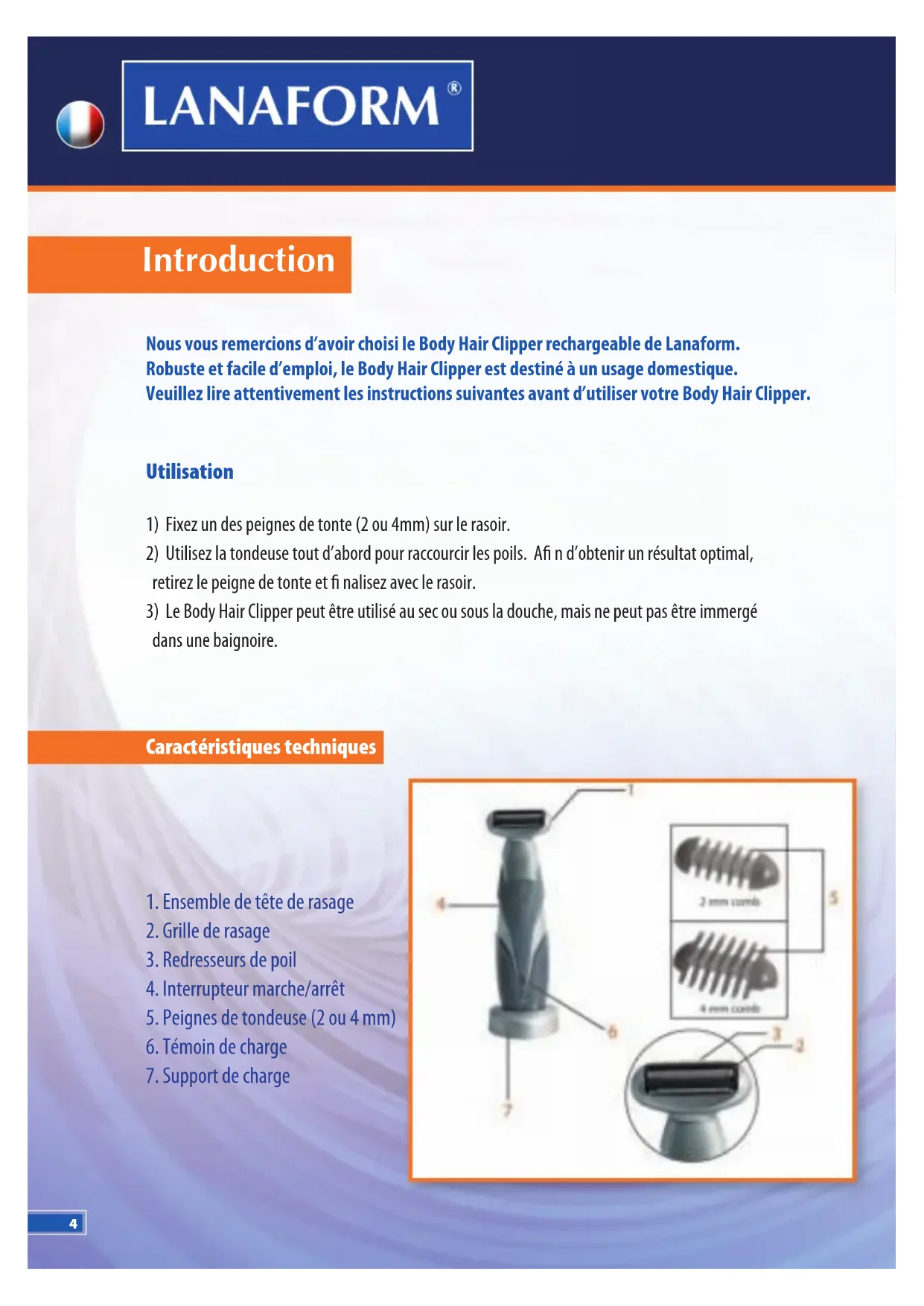 Body Hair ClipperBody Hair Clipper4 Introduction Nous vous remercions d’avoir choisi le Body Hair Clipper rechargeable de Lanaform. Robuste et facile d’emploi, le Body Hair Clipper est destiné à un usage domestique. Veuillez lire attentivement les instructions suivantes avant d’utiliser votre Body Hair Clipper. Utilisation