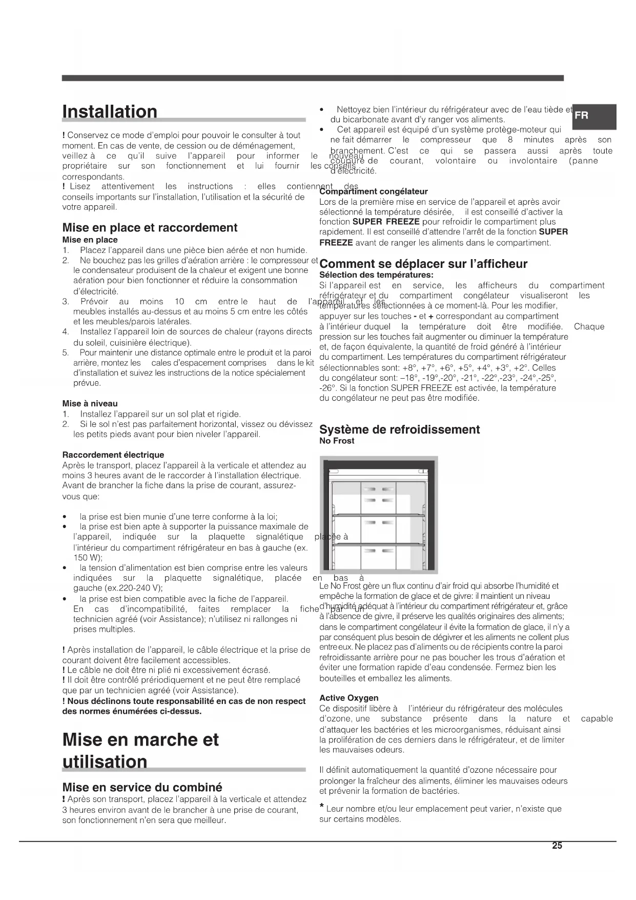 - Cetappareilestéquipéd’unsystèmeprotège-moteurqui nefaitdémarrer le compresseur que 8 minutes après son branchement.C’est ce qui se passera aussi après toute coupurede courant, volontaire ou involontaire (panne d’électricité. Compartiment congélateur Lorsdelapremièremiseenservicedel’appareiletaprèsavoir sélectionnélatempératuredésirée, ilestconseilléd’activerla fonctionSUPER FREEZEpourrefroidirlecompartimentplus rapidement.Ilestconseilléd’attendrel’arrêtdelafonctionSUPER FREEZEavantderangerlesalimentsdanslecompartiment. Comment se déplacer sur l’afficheur Sélection des températures: Sil’appareilest en service, les afficheurs du compartiment réfrigérateuretdu compartiment congélateur visualiseront les températuressélectionnéesàcemoment-là.Pourlesmodifier, appuyersurlestouches-et+correspondantaucompartiment àl’intérieurduquel la température doit être modifiée. Chaque pressionsurlestouchesfaitaugmenteroudiminuerlatempérature et,defaçonéquivalente,laquantitédefroidgénéréàl’intérieur ducompartiment.Lestempératuresducompartimentréfrigérateur sélectionnablessont:+8°,+7°,+6°,+5°,+4°,+3°,+2°.Celles ducongélateursont:–18°,-19°,-20°,-21°,-22°,-23°,-24°,-25°, -26°.SilafonctionSUPERFREEZEestactivée,latempérature ducongélateurnepeutpasêtremodifiée. Système de refroidissement No Frost LeNoFrostgèreunfluxcontinud’airfroidquiabsorbel’humiditéet empêchelaformationdeglaceetdegivre:ilmaintientunniveau d’humiditéadéquatàl’intérieurducompartimentréfrigérateuret,grâce àl’absencedegivre,ilpréservelesqualitésoriginairesdesaliments; danslecompartimentcongélateurilévitelaformationdeglace,iln’ya parconséquentplusbesoindedégivreretlesalimentsnecollentplus entreeux. Neplacezpasd’alimentsouderécipientscontrelaparoi refroidissantearrièrepournepasboucherlestrousd’aérationet éviteruneformationrapided’eaucondensée.Fermezbienles bouteillesetemballezlesaliments. Active Oxygen Cedispositiflibèreà l’intérieurduréfrigérateurdesmolécules d’ozone,une substance présente dans la nature et capable d’attaquerlesbactériesetlesmicroorganismes,réduisantainsi laproliférationdecesderniersdansleréfrigérateur,etdelimiter lesmauvaisesodeurs. Ildéfinitautomatiquementlaquantitéd’ozonenécessairepour prolongerlafraîcheurdesaliments,éliminerlesmauvaisesodeurs etprévenirlaformationdebactéries.26