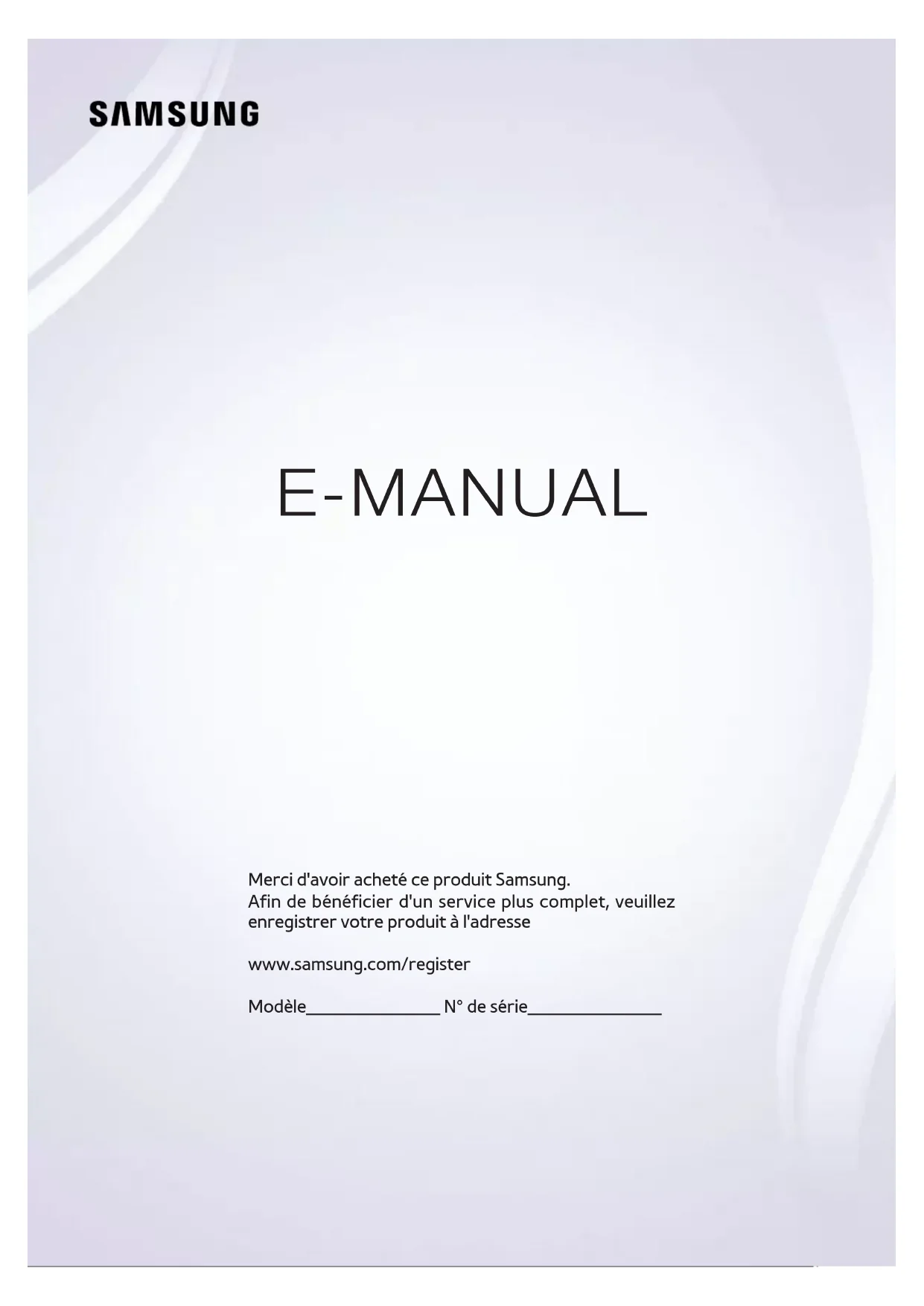 E-MANUAL Merci d'avoir acheté ce produit Samsung. Afin de bénéficier d'un service plus complet, veuillez enregistrer votre produit à l'adresse www.samsung.com/register Modèle______________ N° de série______________Contenu Guides de démarrage Utilisation de Smart Hub 1 Connexion à Internet 1 Configuration de Smart Hub 1 Utilisation de Smart Hub Commande vocale du téléviseur 2 Configuration de Reconnaissance vocale 3 Commande vocale du téléviseur Commande par mouvement du téléviseur 4 Configuration de Commande par mouv. 5 Contrôle du téléviseur à l'aide de gestes Utilisation du Samsung Smart Control 6 Utilisation du téléviseur avec le bouton POINTER 7 Configuration du Samsung Smart Control 7 Pairage du téléviseur au Samsung Smart Control Amélioration de l'expérience visuelle des événements sportifs 8 Activation de la fonction Mode Sport Modification des chaînes 9 Activation de la fonction Modifier la chaîne 9 Réorganisation ou suppression de chaînes Connexions Raccordement d'une antenne (Antenne) Connexion à Internet 11 Mise en place d'une connexion câblée à Internet 12 Mise en place d'une connexion sans fil à Internet Connexion à un réseau au moyen d'un dongle mobile Résolution des problèmes de connectivité Internet 15 Résolution des problèmes de connectivité Internet câblée 16 Résolution des problèmes de connectivité Internet sans fil Connexion de périphériques vidéo 17 Connexion à l'aide d'un câble HDMI 18 Connexion à l'aide d'un câble composant 18 Connexion à l'aide d'un câble composite (A/V) Connexions d'entrée et de sortie audio 19 Connexion à l'aide d'un câble HDMI (ARC) 20 Connexion à l'aide d'un câble audio numérique (optique) 20 Connexion à l'aide d'un casque 20 Connexion à l'aide d'une sortie audio Connexion à un ordinateur 21 Connexion via le port HDMI 22 Connexion à l'aide d'un câble HDMI vers DVI 22 Connexion via votre réseau domestique Connexion d'un périphérique mobile 23 Connexion à l'aide d'un câble MHL vers HDMI 24 Utilisation de Réplication de l'écran 25 Connexion de périphériques mobiles sans routeur sans fil (Wi-Fi Direct) 26 Connexion d'un périphérique mobile via Samsung Smart View Pairage d'un ordinateur portable et du téléviseur - Mise en miroir de PC sans fil (ou KINO TV) Modification du signal d'entrée avec des périphériques externes Remarques sur la connexion 28 Remarque sur la connexion HDMI 29 Remarque sur la connexion des périphériques audio 29 Remarque sur la connexion des ordinateurs 29 Remarque sur la connexion des périphériques mobiles 30 Remarques concernant la connexion pour la mise en miroir de PC sans fil (ou KINO TV) Télécommande et périphériques À propos du Samsung Smart Control Utilisation du Samsung Smart Control 33 Utilisation du téléviseur avec le bouton POINTER 33 Utilisation du téléviseur avec les touches de direction et le bouton Entrer 34 Affichage et utilisation de la télécommande visuelle 35 Pairage du téléviseur au Samsung Smart Control Commande des périphériques externes à l'aide de la télécommande du téléviseur - Utilisation de la télécommande universelle 36 Réglage de la télécommande universelle IIUtilisation du menu Outils sur l'écran du téléviseur Commande du téléviseur à l'aide d'un clavier 38 Connexion d'un clavier 39 Utilisation du clavier Commande du téléviseur à l'aide d'une souris 40 Connexion d'une souris USB 40 Utilisation d'une souris Connexion d'une manette Bluetooth Saisie de texte à l'aide du clavier QWERTY à l'écran 41 Utilisation des autres fonctions Fonctions Smart Smart Hub 43 Supprimer ou épingler un élément dans le groupe Récente 43 Lancement automatique de Smart Hub 43 Test des connexions Smart Hub 44 Utilisation du didacticiel Smart Hub 44 Réinitialisation de Smart Hub Utilisation de Smart Hub avec un Compte Samsung 45 Création d'un compte Samsung 46 Ouverture d'un compte Samsung 46 Association de votre compte Samsung à vos comptes de services externes 47 Modification et ajout d'informations à un compte Samsung 47 Suppression d'un compte Samsung du téléviseur Utilisation du service GAMES 48 Gestion des jeux via le menu contextuel Options 48 Affichage de l'écran d'informations détaillées 49 Installation et exécution d'un jeu 49 Gestion des jeux téléchargés ou achetés Utilisation du service Mes Applications 51 Gestion des applications téléchargées avec le menu contextuel Options 52 Installation d'une application 52 Activation des mises à jour automatiques des applications 53 Suppression d'une application du téléviseur 53 Verrouillage et déverrouillage des applications 53 Mise à jour des applications 53 Réorganisation des applications 53 Notation des applications achetées 53 Utilisation des autres caractéristiques et fonctions de l'application Utilisation de l'e-Manual 54 Lancement du manuel électronique 54 Utilisation des boutons du manuel électronique Utilisation du navigateur Web. 55 Préférences de navigation Utilisation du service MON CONTENU 56 À lire avant de lire du contenu multimédia 57 Lecture de contenu multimédia sur un ordinateur ou un périphérique mobile 57 Lecture de contenu multimédia enregistré sur un périphérique USB 58 Boutons et fonctions disponibles pendant le visionnage de photos 59 Boutons et fonctions disponibles pendant le visionnage de vidéos 61 Boutons et fonctions disponibles pendant la lecture de musique 62 Écoute de musique en qualité HD 62 Fonctions de l'écran de liste de contenu multimédia Utilisation du service NewsON 63 Actualités 63 Météo Commande vocale du téléviseur 65 À lire avant d'utiliser la fonction de reconnaissance vocale 65 Apprentissage des principes de base de la reconnaissance vocale 66 Utilisation de la reconnaissance vocale impérative 66 Utilisation de la reconnaissance vocale interactive à une courte distance Contrôle du téléviseur à l'aide de gestes (Commande par mouv.) 67 Test de la l