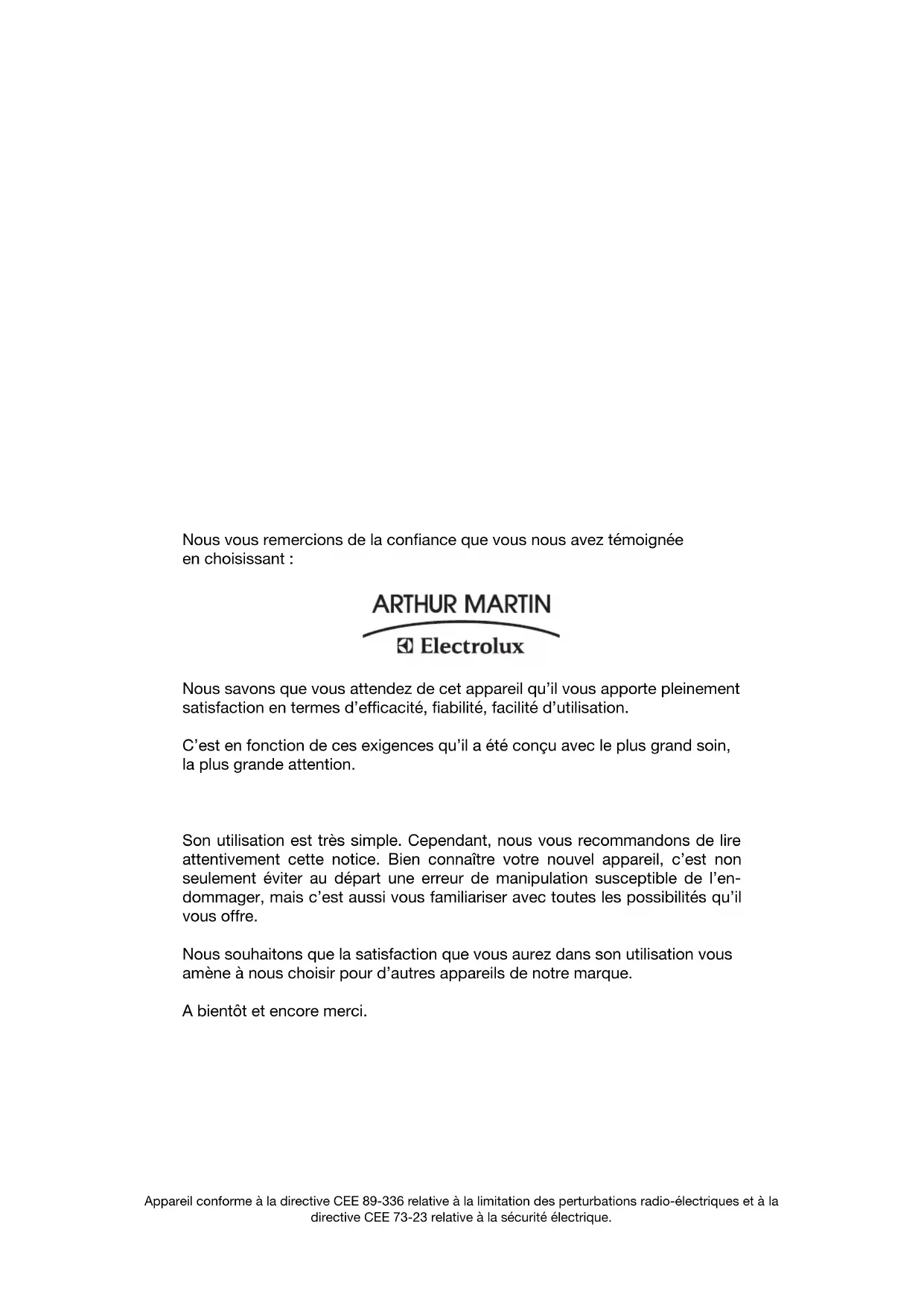 MODE D'EMPLOI ASF 2750 Arthur Martin-Electrolux