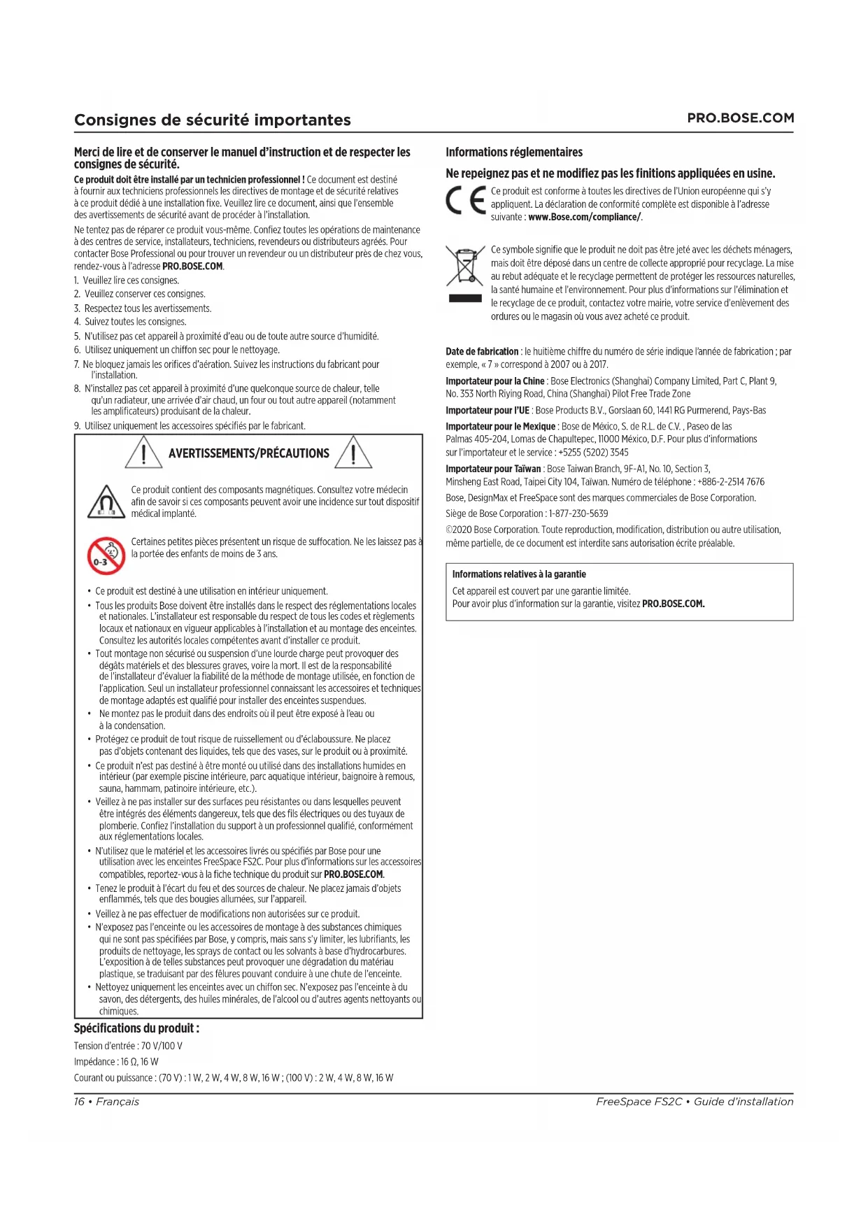 Informations réglementaires Ne repeignez pas et ne modifiez pas les finitions appliquées en usine. Ce produit est conforme à toutes les directives de l’Union européenne qui s’y appliquent. La déclaration de conformité complète est disponible à l’adresse suivante: www.Bose.com/compliance/. Ce symbole signifie que le produit ne doit pas être jeté avec les déchets ménagers, mais doit être déposé dans un centre de collecte approprié pour recyclage. La mise au rebut adéquate et le recyclage permettent de protéger lesressources naturelles, la santé humaine et l’environnement. Pour plus d’informations sur l’élimination et le recyclage de ce produit, contactez votre mairie, votre service d’enlèvement des ordures ou le magasin où vous avez acheté ce produit. Date de fabrication: le huitième chire du numéro de série indique l’année de fabrication; par exemple, «7» correspond à 2007 ou à 2017. Importateur pour la Chine: Bose Electronics (Shanghai) Company Limited, Part C, Plant 9, No. 353 North Riying Road, China (Shanghai) Pilot Free Trade Zone Importateur pour l’UE: Bose Products B.V., Gorslaan 60, 1441 RG Purmerend, Pays-Bas Importateur pour le Mexique: Bose de México, S. de R.L. de C.V. , Paseo de las Palmas 405-204, Lomas de Chapultepec, 11000 México, D.F. Pour plus d’informations surl’importateur et le service: +5255 (5202) 3545 Importateur pour Taïwan: Bose Taiwan Branch, 9F-A1, No. 10, Section 3, Minsheng East Road, Taipei City 104, Taïwan. Numéro de téléphone: +886-2-2514 7676 Bose, DesignMax et FreeSpace sont des marques commerciales de Bose Corporation. Siège de Bose Corporation: 1-877-230-5639 ©2020 Bose Corporation. Toute reproduction, modification, distribution ou autre utilisation, même partielle, de ce document est interdite sans autorisation écrite préalable. Informations relatives à la garantie Cet appareil est couvert par une garantie limitée. Pour avoir plus d’information sur la garantie, visitez PRO.BOSE.COM. Spécifications du produit: Tension d’entrée: 70V/100V Impédance: 16Ω, 16W Courant ou puissance: (70V): 1W, 2W, 4W, 8W, 16W; (100V): 2W, 4W, 8W, 16W
