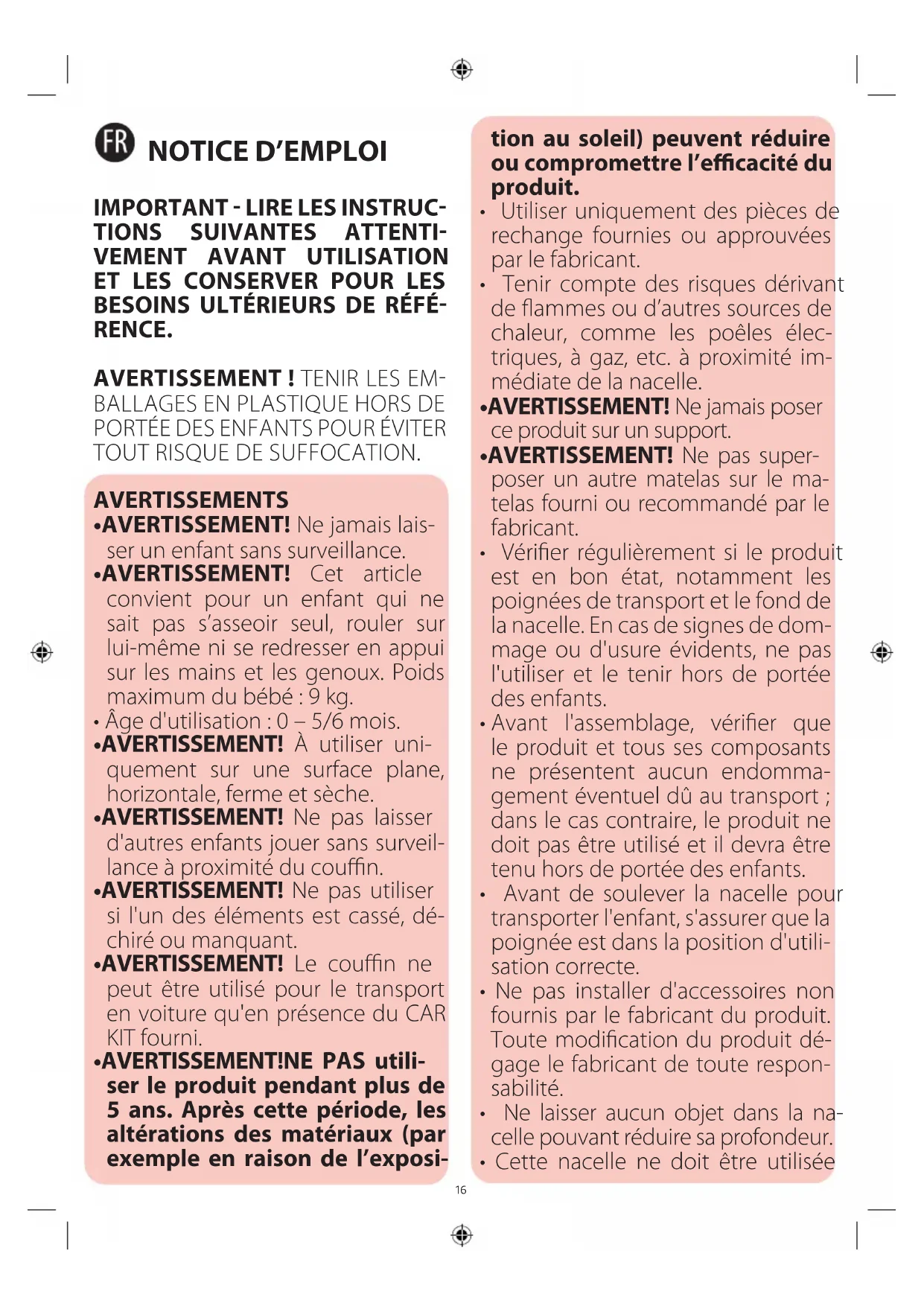 - Ne jamais utiliser la nacelle pour faire dormir l'enfant pendant des périodes prolongées ; ce produit ne remplace pas un lit.