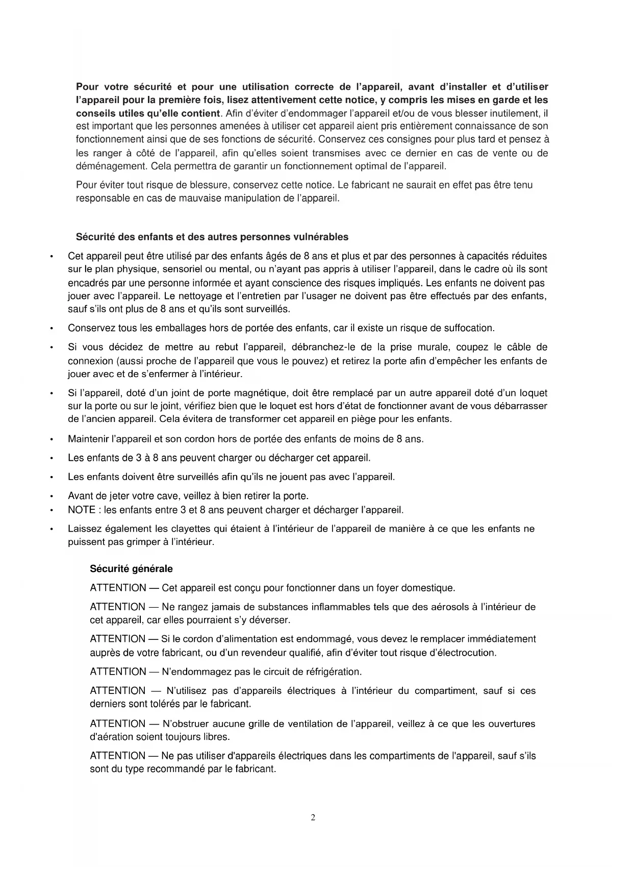 - Laissez également les clayettes qui étaient à l’intérieur de l’appareil de manière à ce que les enfants ne puissent pas grimper à l’intérieur. Sécurité générale ATTENTION — Cet appareil est conçu pour fonctionner dans un foyer domestique. ATTENTION — Ne rangez jamais de substances inflammables tels que des aérosols à l’intérieur de cet appareil, car elles pourraient s’y déverser. ATTENTION — Si le cordon d’alimentation est endommagé, vous devez le remplacer immédiatement auprès de votre fabricant, ou d’un revendeur qualifié, afin d’éviter tout risque d’électrocution. ATTENTION — N’endommagez pas le circuit de réfrigération. ATTENTION — N’utilisez pas d’appareils électriques à l’intérieur du compartiment, sauf si ces derniers sont tolérés par le fabricant. ATTENTION — N’obstruer aucune grille de ventilation de l’appareil, veillez à ce que les ouvertures d'aération soient toujours libres. ATTENTION — Ne pas utiliser d'appareils électriques dans les compartiments de l'appareil, sauf s’ils sont du type recommandé par le fabricant.3 Attention : Risque d’incendie Si le circuit de réfrigération était endommagé : - Evitez les flammes nues et toute source d’inflammation. - Ventilez bien la pièce où se trouve l’appareil. Il est dangereux de modifier la composition de cet appareil, de quelque manière que ce soit. Tout dommage fait au cordon peut provoquer un court-circuit, et/ou une électrocution Sécurité électrique