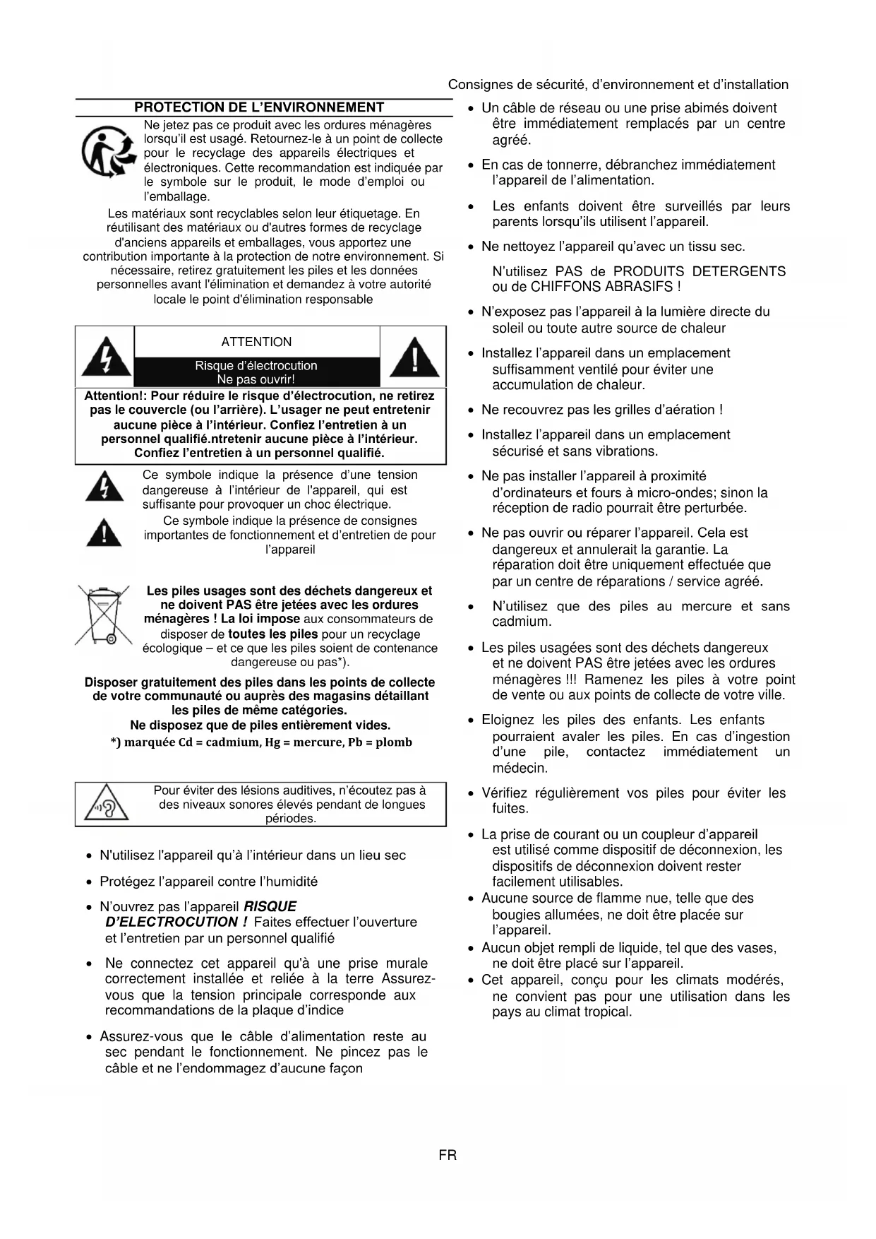 Disposer gratuitement des piles dans les points de collecte de votre communauté ou auprès des magasins détaillant les piles de même catégories. Ne disposez que de piles entièrement vides. *) marquée Cd = cadmium, Hg = mercure, Pb = plomb
