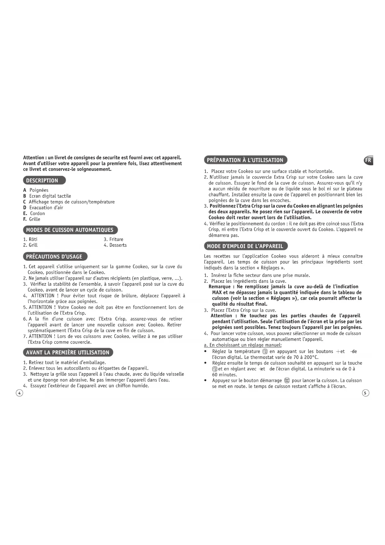 1 Cet appareil s’utilise uniquement sur la gamme Cookeo, sur la cuve du Cookeo, positionnée dans le Cookeo 2 Ne jamais utiliser l’appareil sur d’autres récipients (en plastique, verre, ) 3 Vérifiez la stabilité de l’ensemble, à savoir l’appareil posé sur la cuve du Cookeo, avant de lancer un cycle de cuisson 4 ATTENTION ! Pour éviter tout risque de brûlure, déplacez l’appareil à l’horizontale grâce aux poignées 5 ATTENTION ! Votre Cookeo ne doit pas être en fonctionnement lors de l’utilisation de l’Extra Crisp 6 A la fin d’une cuisson avec l’Extra Crisp, assurez-vous de retirer l’appareil avant de lancer une nouvelle cuisson avec Cookeo Retirer systématiquement l’Extra Crisp de la cuve en fin de cuisson 7 ATTENTION ! Lors de vos cuissons avec Cookeo, veillez à ne pas utiliser l’Extra Crisp comme couvercle 1 Retirez tout le matériel d’emballage 2 Enlevez tous les autocollants ou étiquettes de l’appareil 3 Nettoyez la grille sous l’appareil à l’eau chaude, avec du liquide vaisselle et une éponge non abrasive Ne pas immerger l’appareil dans l’eau 4 Essuyez l’extérieur de l’appareil avec un chiffon humide