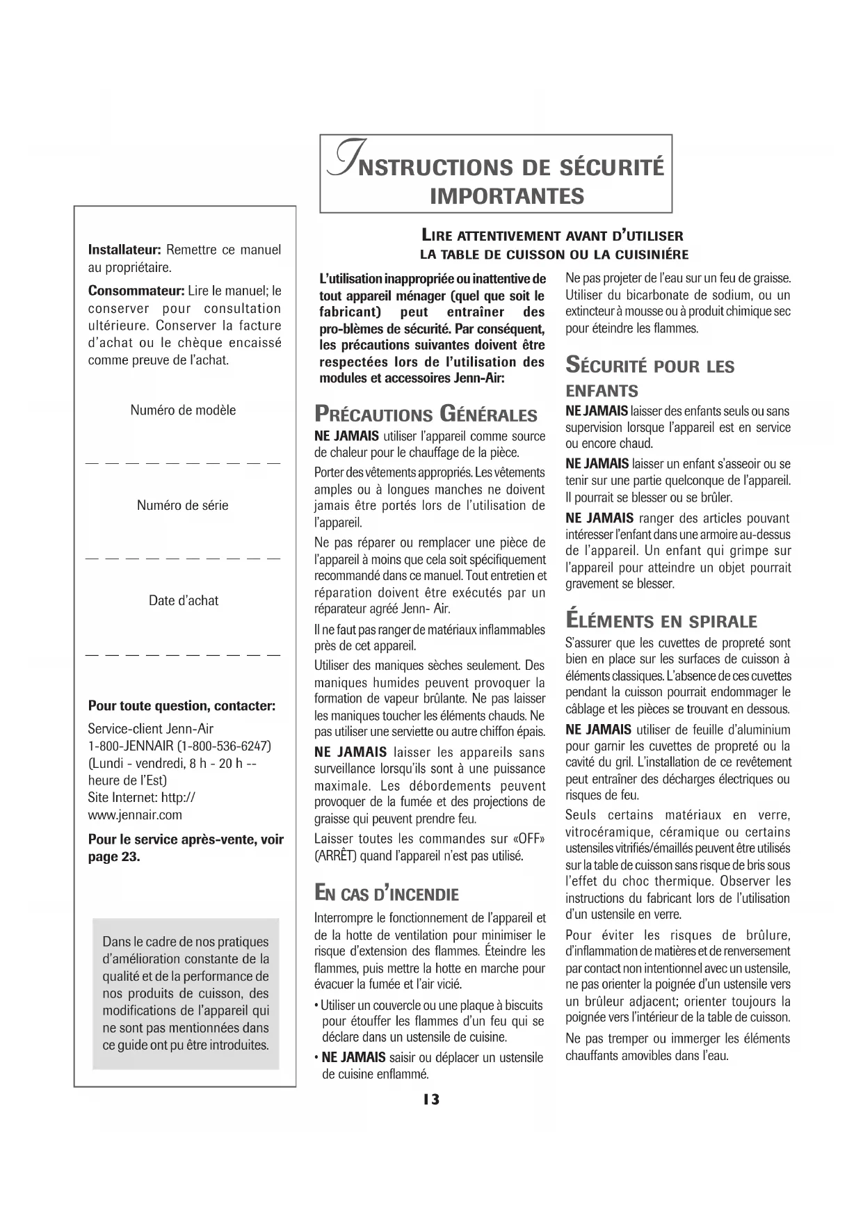 S’assurer que les cuvettes de propreté sontbien en place sur les surfaces de cuisson àéléments classiques. L’absence de ces cuvettespendant la cuisson pourrait endommager lecâblage et les pièces se trouvant en dessous.NE JAMAIS utiliser de feuille d’aluminiumpour garnir les cuvettes de propreté ou lacavité du gril. L’installation de ce revêtementpeut entraîner des décharges électriques ourisques de feu.Seuls certains matériaux en verre,vitrocéramique, céramique ou certainsustensiles vitrifiés/émaillés peuvent être utiliséssur la table de cuisson sans risque de bris sousl’effet du choc thermique. Observer lesinstructions du fabricant lors de l’utilisationd’un ustensile en verre.Pour éviter les risques de brûlure,d’inflammation de matières et de renversementpar contact non intentionnel avec un ustensile,ne pas orienter la poignée d’un ustensile versun brûleur adjacent; orienter toujours lapoignée vers l’intérieur de la table de cuisson.Ne pas tremper ou immerger les élémentschauffants amovibles dans l’eau.Installateur: Remettre ce manuelau propriétaire.Consommateur: Lire le manuel; leconserver pour consultationultérieure. Conserver la factured’achat ou le chèque encaissécomme preuve de l’achat.Numéro de modèle__ __ __ __ __ __ __ __ __ __Numéro de série__ __ __ __ __ __ __ __ __ __Date d’achat__ __ __ __ __ __ __ __ __ __Pour toute question, contacter:Service-client Jenn-Air1-800-JENNAIR (1-800-536-6247)(Lundi - vendredi, 8 h - 20 h --heure de l’Est)Site Internet: http://www.jennair.comPour le service après-vente, voirpage 23.Dans le cadre de nos pratiquesd’amélioration constante de laqualité et de la performance denos produits de cuisson, desmodifications de l’appareil quine sont pas mentionnées dansce guide ont pu être introduites.