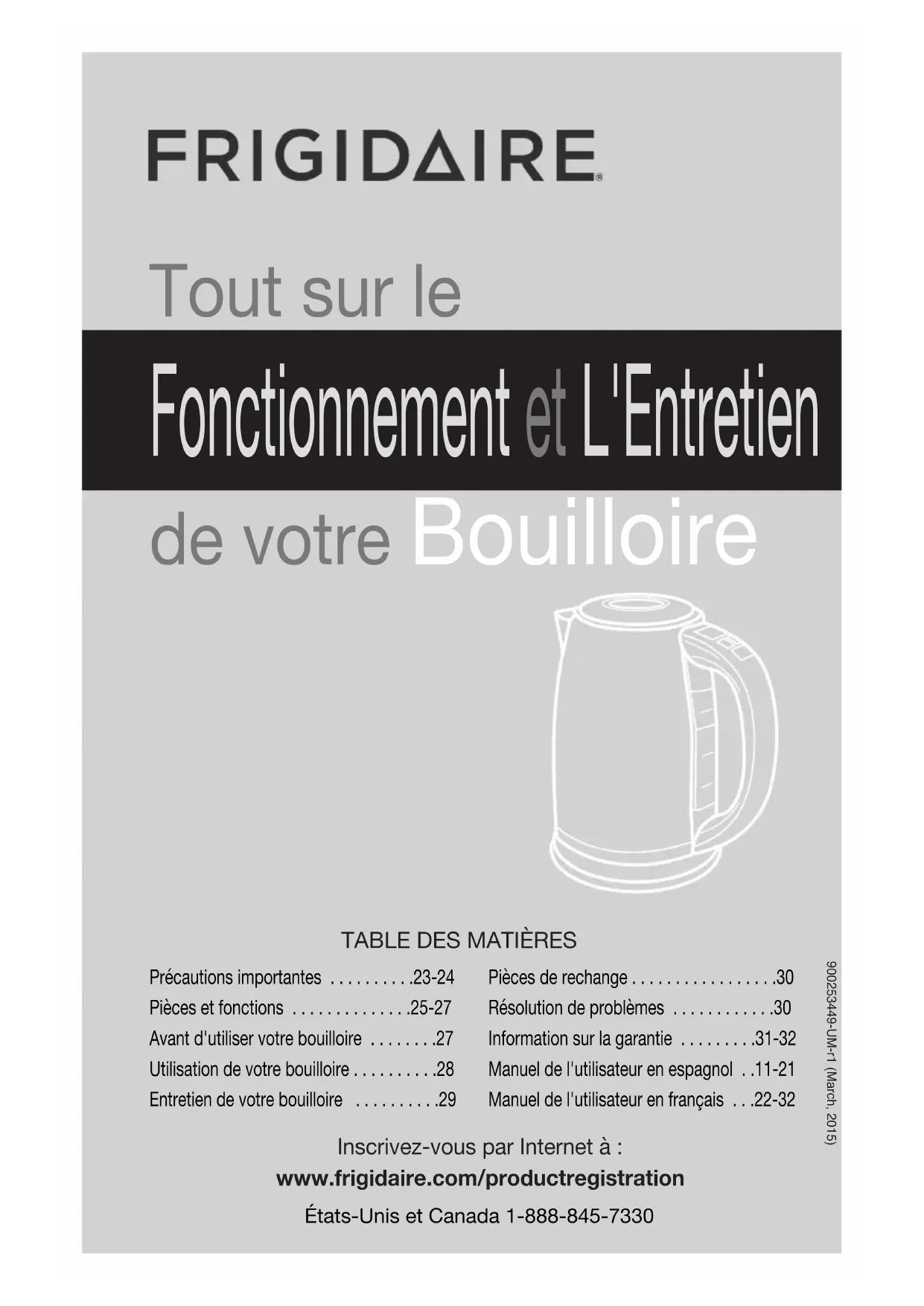 Tout sur le Fonctionnement et L'Entretien de votre Bouilloire Inscrivez-vous par Internet à : www.frigidaire.com/productregistration États-Unis et Canada 1-888-845-7330