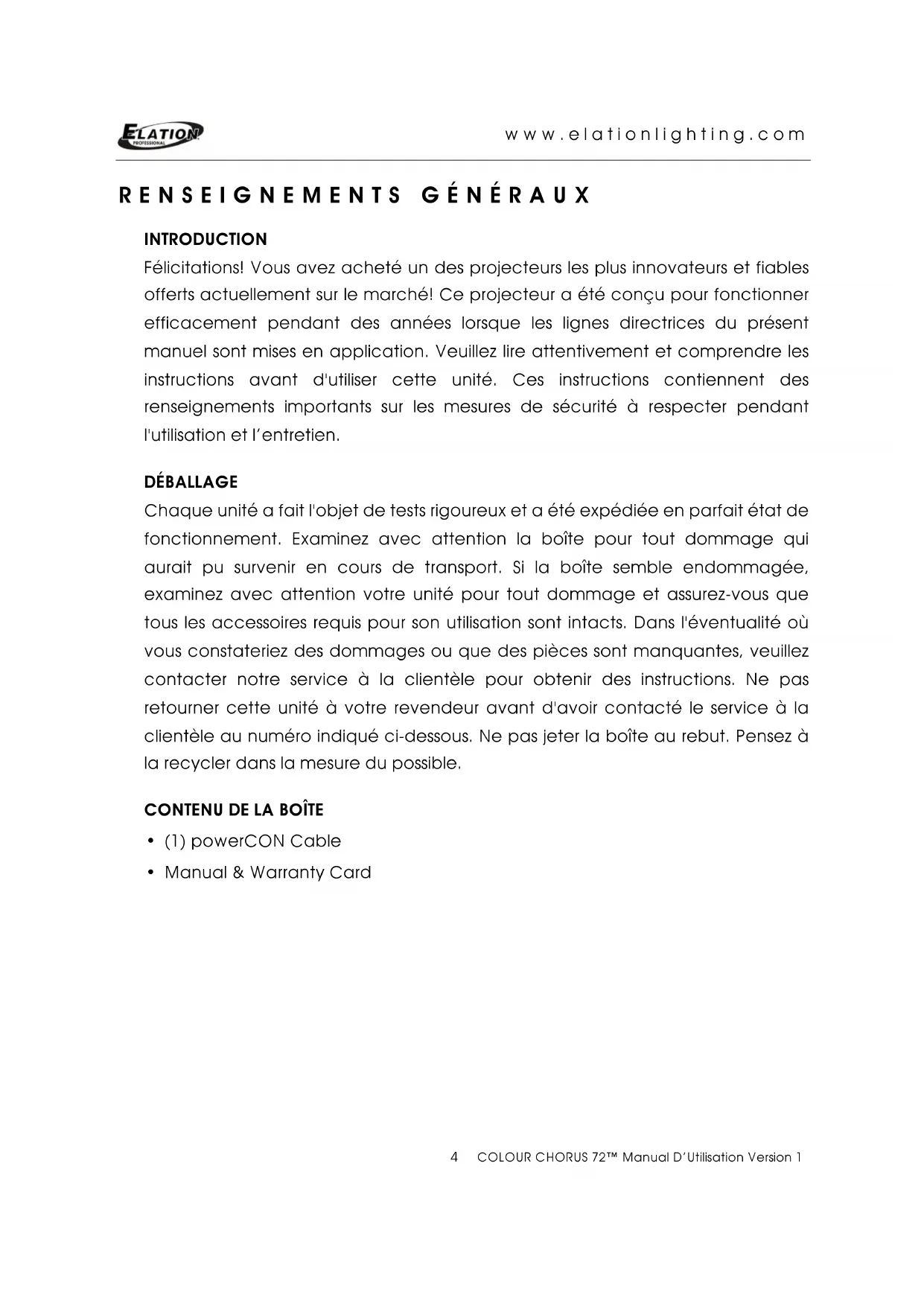 MANUAL D’UTILISATIONwww.elationlighting.com 2 COLOUR CHORUS 72™ Manual D’Utilisation Version 1 ©2015 ELATION PROFESSIONAL. Tous droits réservés. L'information, les spécifications, les tableaux, les images et les instructions contenus dans les présentes sont sujets à changement sans préavis. Le logo ELATION PROFESSIONAL, les noms et les numéros identifiant les produits contenus dans les présentes sont des marques de commerce de ELATION PROFESSIONAL. La protection du droit d'auteur revendiquée couvre toutes les formes de documents et d'informations dont la propriété intellectuelle est à présent assurée par la loi ou accordée ci-après. Les noms de produits utilisés dans le présent document peuvent être des marques de commerce ou des marques déposées de leurs sociétés respectives et sont reconnues ici comme telles. Tous les noms de produits et toutes les marques autres que ELATION sont des marques de commerce ou des marques déposées de leurs sociétés respectives. ELATION PROFESSIONAL et toutes les sociétés affiliées mentionnées dans les présentes ne se tiennent aucunement responsables des dommages matériels, immobiliers et électriques, des préjudices corporels ni des préjudices financiers directs ou indirects résultant de l'utilisation de toute information contenue dans les présentes, et (ou) résultant du montage, de l'installation, du câblage et de l'utilisation inadéquats, non sécuritaires, imprudents et inappropriés de ce produit.