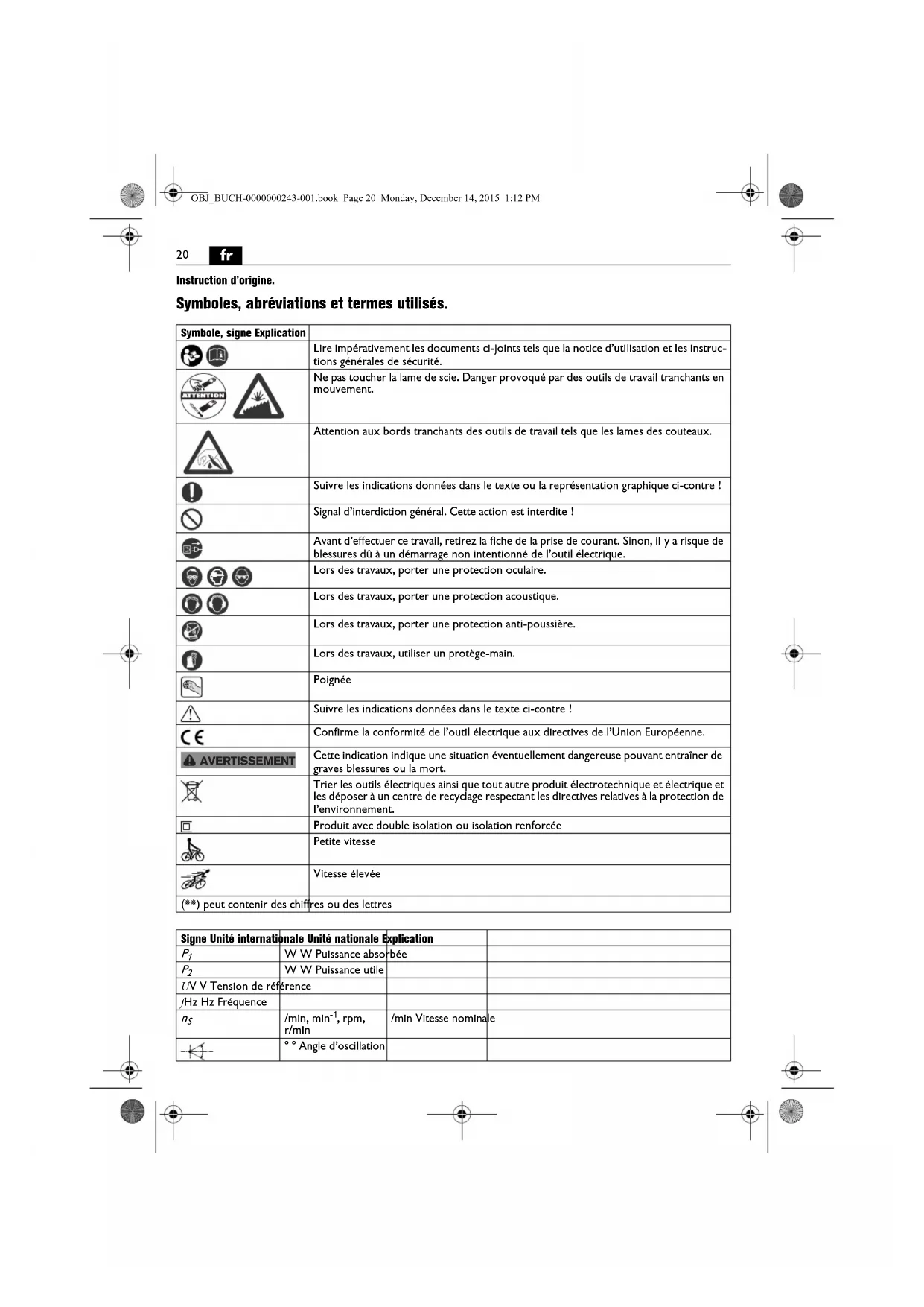 Instruction d’origine. Symboles, abréviations et termes utilisés. Symbole, signe Explication Lire impérativement les documents ci-joints tels que la notice d’utilisation et les instruc- tions générales de sécurité. Ne pas toucher la lame de scie. Danger provoqué par des outils de travail tranchants en mouvement. Attention aux bords tranchants des outils de travail tels que les lames des couteaux. Suivre les indications données dans le texte ou la représentation graphique ci-contre ! Signal d’interdiction général. Cette action est interdite ! Avant d’effectuer ce travail, retirez la fiche de la prise de courant. Sinon, il y a risque de blessures dû à un démarrage non intentionné de l’outil électrique. Lors des travaux, porter une protection oculaire. Lors des travaux, porter une protection acoustique. Lors des travaux, porter une protection anti-poussière. Lors des travaux, utiliser un protège-main. Poignée Suivre les indications données dans le texte ci-contre ! Confirme la conformité de l’outil électrique aux directives de l’Union Européenne. Cette indication indique une situation éventuellement dangereuse pouvant entraîner de graves blessures ou la mort. Trier les outils électriques ainsi que tout autre produit électrotechnique et électrique et les déposer à un centre de recyclage respectant les directives relatives à la protection de l’environnement. Produit avec double isolation ou isolation renforcée Petite vitesse Vitesse élevée (**) peut contenir des chiffres ou des lettres AVERTISSEMENT Signe Unité internationale Unité nationale Explication