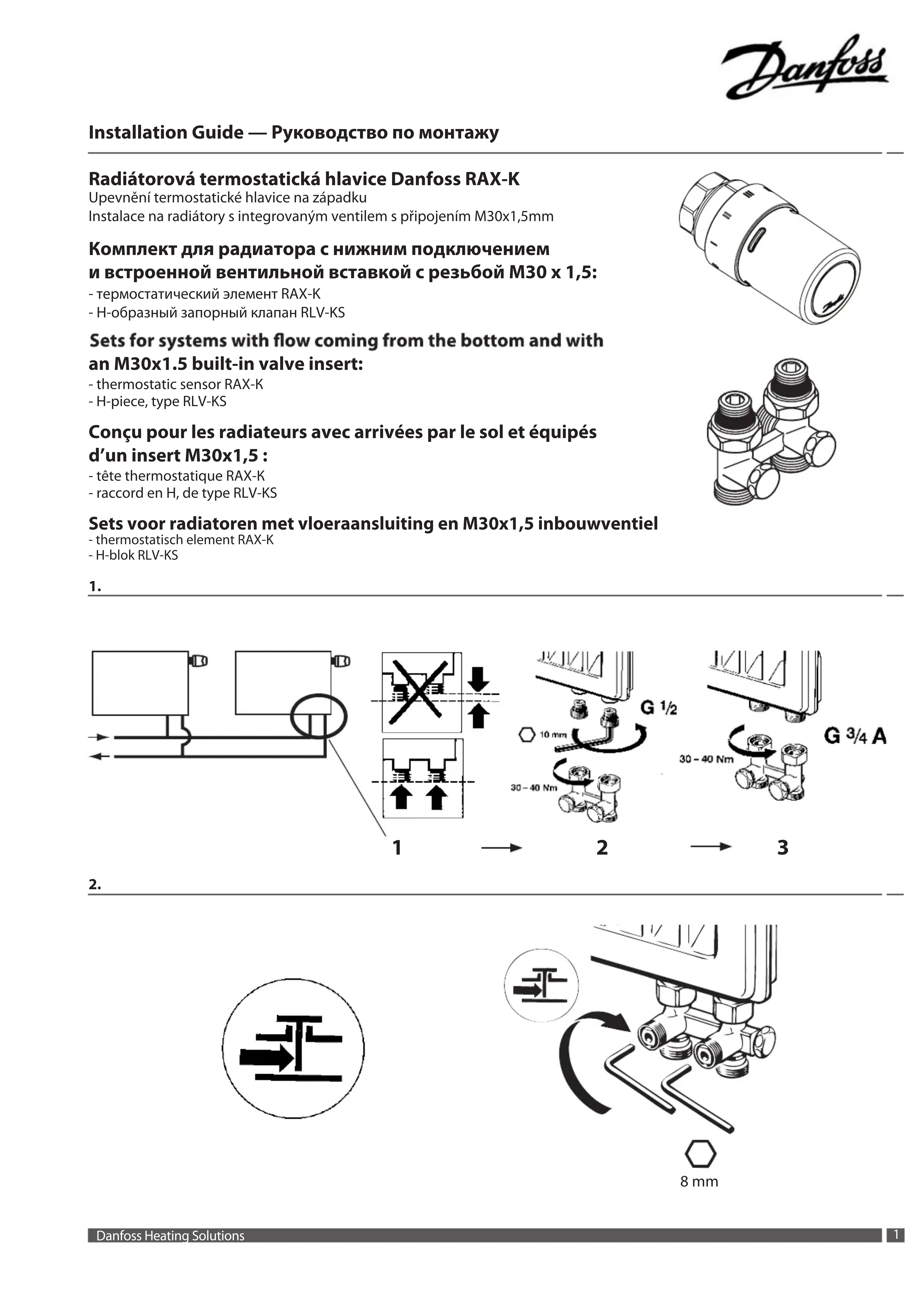 an M30x1.5 built-in valve insert: - thermostatic sensor RАX-К - H-piece, type RLV-KS d’un insert M30x1,5 : Conçu pour les radiateurs avec arrivées par le sol et équipés - tête thermostatique RАX-К - raccord en H, de type RLV-KS Sets voor radiatoren met vloeraansluiting en M30x1,5 inbouwventiel - thermostatisch element RAX-K- H-blok RLV-KS 8 mm 1 2 3Installation Guide