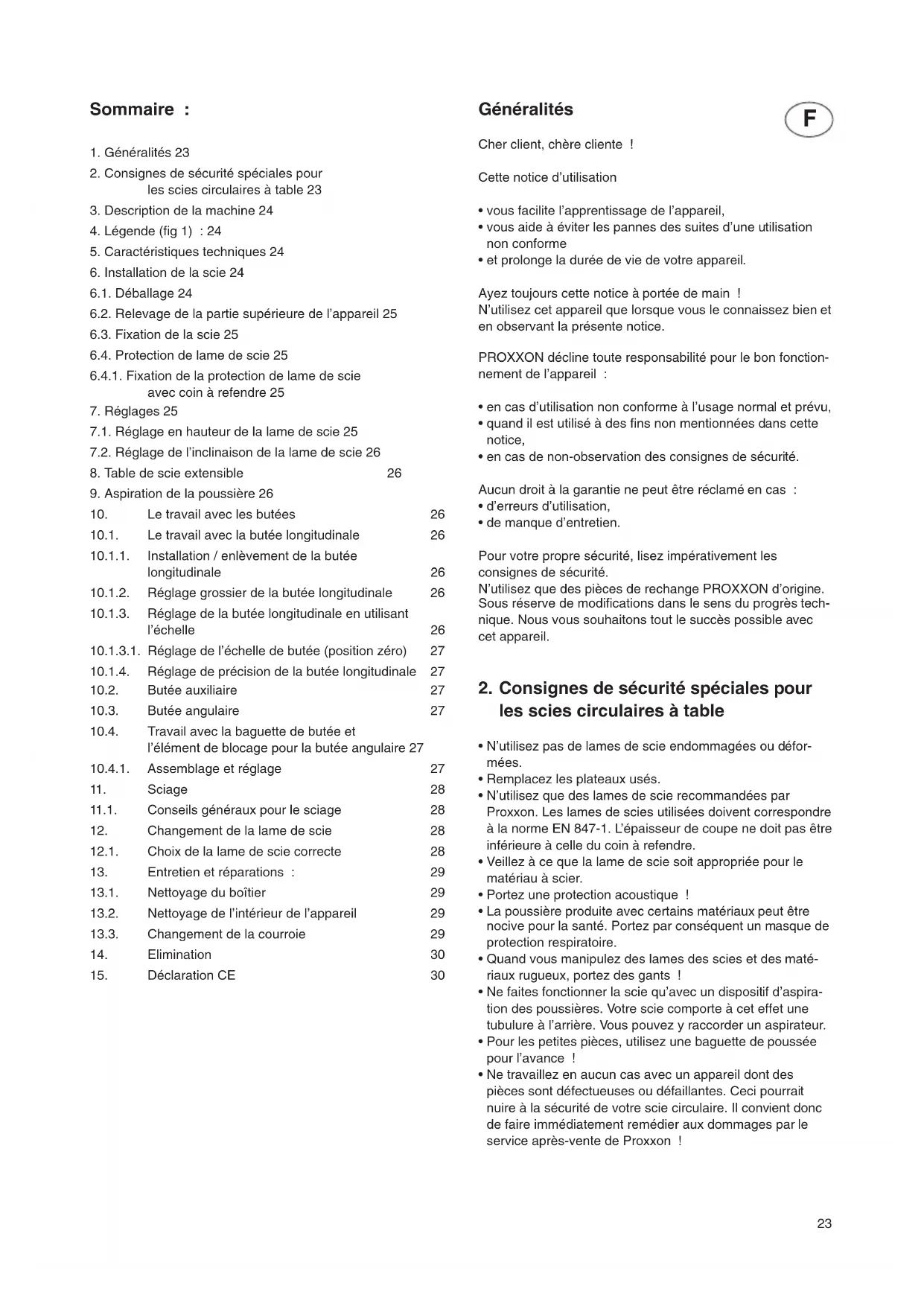 - Consignes de sécurité spéciales pour les scies circulaires à table 23