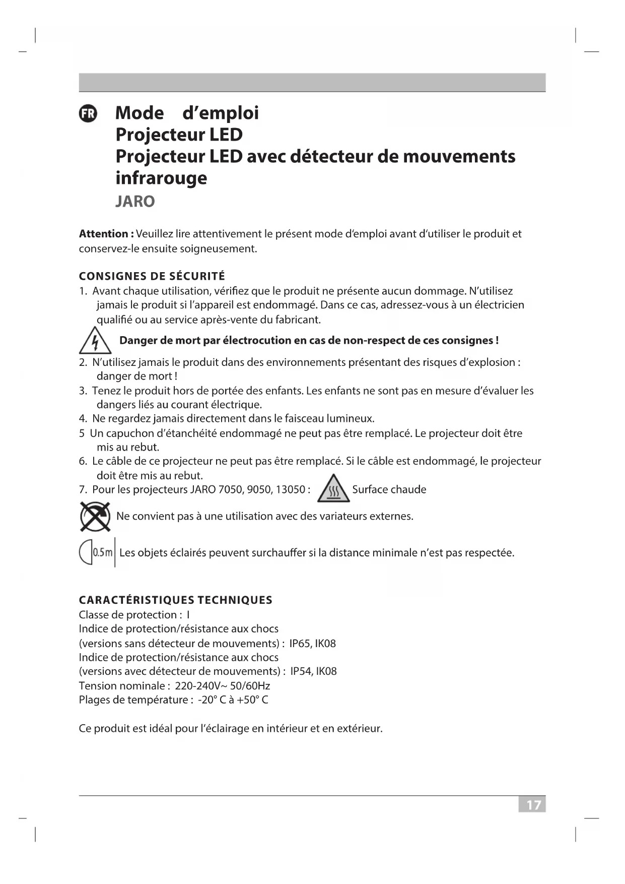Classe de protection : I Indice de protection/résistance aux chocs (versions sans détecteur de mouvements) : IP65, IK08 Indice de protection/résistance aux chocs (versions avec détecteur de mouvements) : IP54, IK08 Tension nominale : 220-240V~ 50/60Hz Plages de température : -20° C à +50° C Ce produit est idéal pour l‘éclairage en intérieur et en extérieur. 20P114 LED Strahler Jaro PIR 0533228 210327.indd 17 27.03.2021 16:10:481818 Mode d’emploi JARO