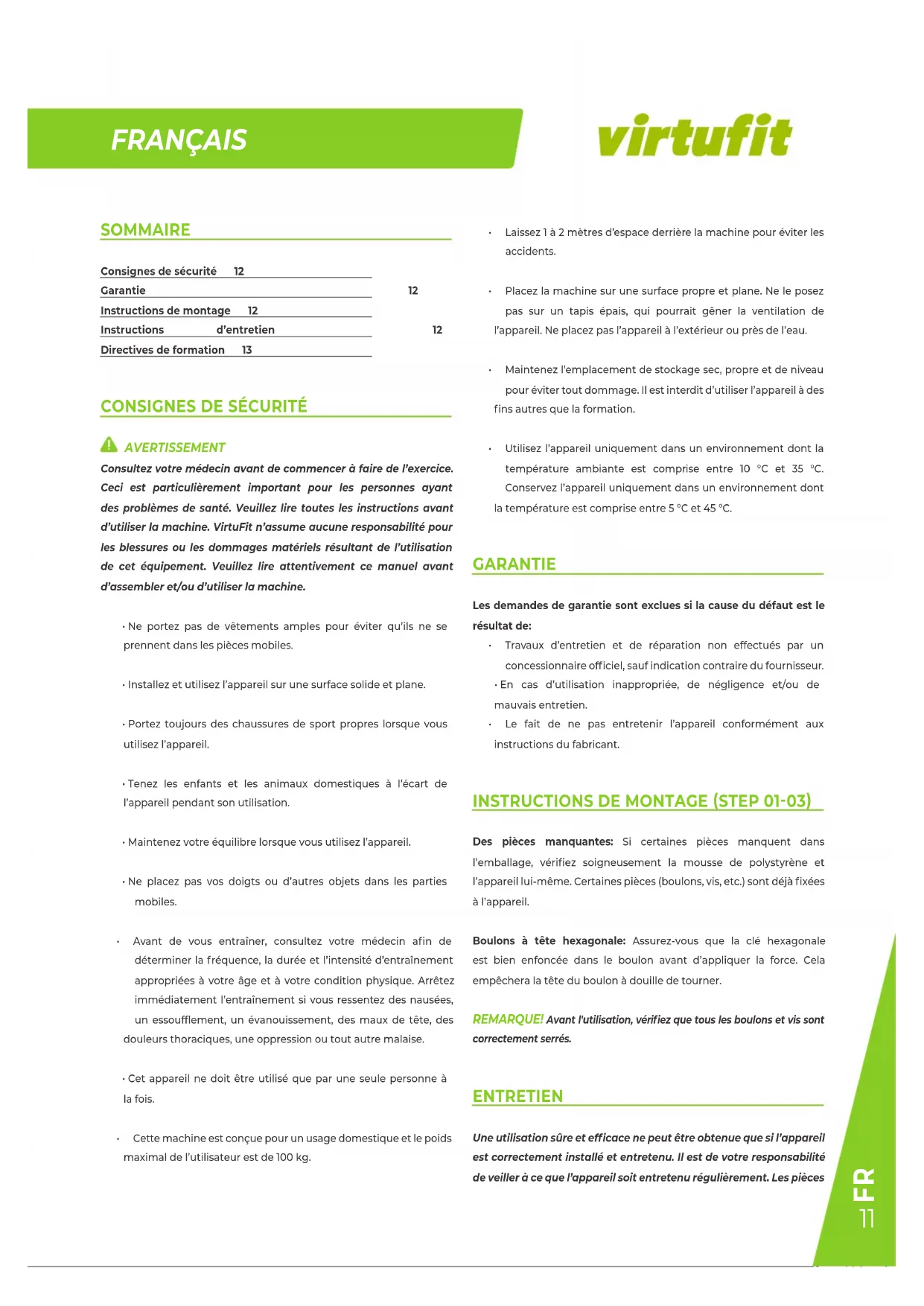 Consultez votre médecin avant de commencer à faire de l'exercice. Ceci est particulièrement important pour les personnes ayant des problèmes de santé. Veuillez lire toutes les instructions avant d'utiliser la machine. VirtuFit n'assume aucune responsabilité pour les blessures ou les dommages matériels résultant de l'utilisation de cet équipement. Veuillez lire attentivement ce manuel avant d'assembler et/ou d'utiliser la machine.
