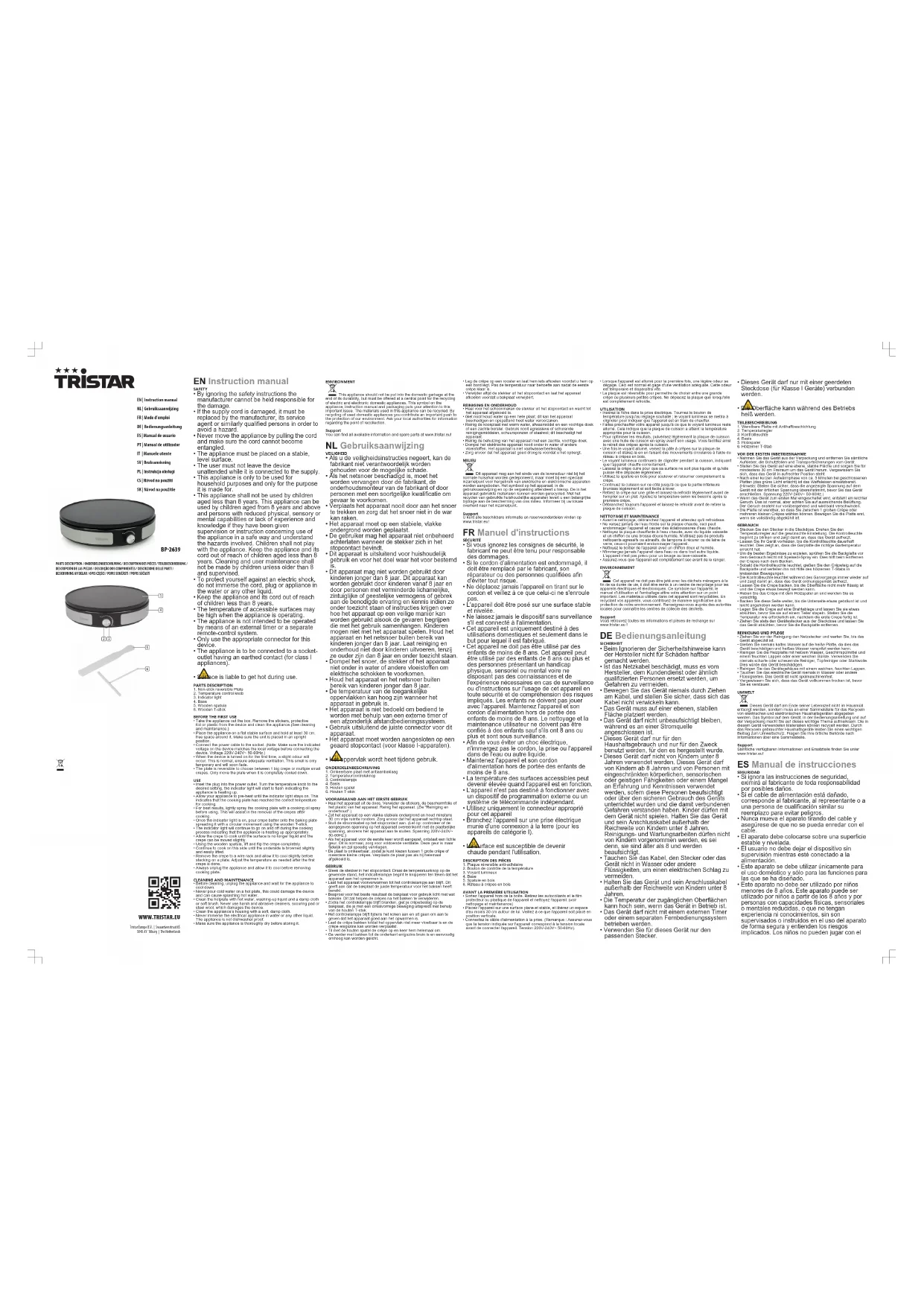 - La surface est susceptible de devenir chaude pendant l'utilisation. DESCRIPTION DES PIÈCES1. Plaque réversible anti-adhésive2. Bouton de contrôle de la température3. Voyant lumineux4. Base5. Spatule en bois6. Râteau à crêpes en boisAVANT LA PREMIÈRE UTILISATION• Sortez l'appareil hors de la boîte.Retirez les autocollants et le filmprotecteur ou plastique de l'appareil et nettoyez l'appareil. (voirnettoyage et maintenance)• Placez l'appareil sur une surface plane et stable, et libérez un espaced'au moins 30 cm autour de lui. Veillez à ce que l'appareil soit placé enposition verticale.• Connectez le câble d'alimentation à la prise. (Remarque : Assurez-vousque la tension indiquée sur l'appareil correspond à la tension localeavant de connecter l'appareil. Tension 220V-240V~ 50-60Hz).• Lorsque l'appareil est allumé pour la première fois, une légère odeur sedégage. Ceci est normal et gage d'une ventilation adéquate. Cette odeurest temporaire et disparaîtra vite.• La plaque est réversible pour permettre de choisir entre une grandecrêpe ou plusieurs petites crêpes. Ne déplacez la plaque que lorsqu'elleest complètement refroidie.UTILISATION• Insérez la fiche dans la prise électrique. Tournez le bouton detempérature jusqu'au réglage souhaité ; le voyant lumineux se mettra àclignoter pour indiquer que l'appareil est en train de chauffer.• Faites préchauffer votre appareil jusqu'à ce que le voyant lumineux resteallumé. Cela indique que la plaque de cuisson a atteint la températureappropriée pour la cuisson.• Pour optimiser les résultats, pulvérisez légèrement la plaque de cuissonavec une huile de cuisson en spray avant son usage. Vous facilitez ainsile retrait des crêpes après la cuisson.• Une fois le voyant allumé, versez la pâte à crêpes sur la plaque decuisson et étalez-la en en faisant des mouvements circulaires à l'aide durâteau à crêpes en bois.• Le voyant lumineux continuera de clignoter pendant la cuisson, indiquantque l'appareil chauffe correctement.• Laissez la crêpe cuire pour que sa surface ne soit plus liquide et qu'ellepuisse être déplacée légèrement.• Utilisez la spatule en bois pour soulever et retourner complètement lacrêpe.• Continuez la cuisson sur ce côté jusqu'à ce que la partie inférieurebrunisse légèrement et soit facile à lever.• Retirez la crêpe sur une grille et laissez-la refroidir légèrement avant del'empiler sur un plat. Ajustez la température selon les besoins après lapremière crêpe.• Débranchez toujours l'appareil et laissez-le refroidir avant de retirer laplaque de cuisson.NETTOYAGE ET MAINTENANCE• Avant le nettoyage, débranchez l'appareil et attendez qu'il refroidisse.• Ne versez jamais de l’eau froide sur la plaque chaude, ceci peutendommager l’appareil et causer des éclaboussures d'eau chaude.• Nettoyez la plaque chauffante à l'eau chaude, avec du liquide vaisselleet un chiffon ou une brosse douce humide. N'utilisez pas de produitsnettoyants agressifs ou abrasifs, de tampons à récurer ou de laine deverre, ceux-ci pourraient endommager l'appareil.• Nettoyez le boîtier de l'appareil avec un chiffon doux et humide.• N'immergez jamais l'appareil dans l'eau ou dans tout autre liquide.L'appareil n'est pas prévu pour un lavage au lave-vaisselle.• Assurez-vous que l'appareil est complètement sec avant de le ranger.ENVIRONNEMENTCet appareil ne doit pas être jeté avec les déchets ménagers à lafin de sa durée de vie, il doit être remis à un centre de recyclage pour lesappareils électriques et électroniques. Ce symbole sur l'appareil, lemanuel d'utilisation et l'emballage attire votre attention sur un pointimportant. Les matériaux utilisés dans cet appareil sont recyclables. Enrecyclant vos appareils, vous contribuez de manière significative à laprotection de notre environnement. Renseignez-vous auprès des autoritéslocales pour connaître les centres de collecte des déchets.SupportVous retrouvez toutes les informations et pièces de rechange surwww.tristar.eu! DEBedienungsanleitung SICHERHEIT