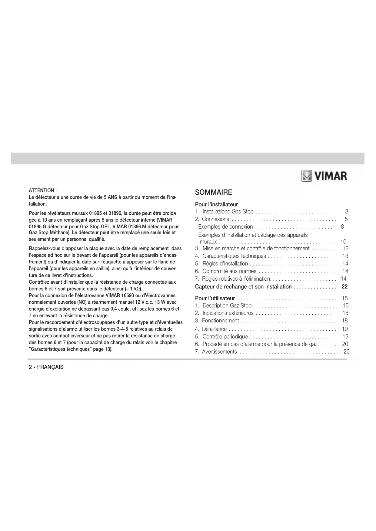 . La collecte séparée appropriée pour l’envoi successif de l’appareil en fin de vie au recyclage, au traitement et à l’élimination dans le respect de l’environnement contribue à éviter les effets négatifs sur l’environnement et sur la santé et favorise le réemploi et/ou le recyclage des matériaux dont l’appareil est composé.FRANÇAIS - 15 Pour l'utilisateur ATTENTION Le révélateur que vous venez d’acquérir est un produit technolo- giquement avancé, conçu et réalisé selon les normes techniques actuelles en vigueur et les directives CE. La vie de l'appareil est de 5 ANS à partir du moment où il a été installé. Pour les révélateurs muraux 01895 et 01896, la durée peut être prolongée à 10 ans en remplaçant après 5 ans le détecteur interne (VIMAR 01895.G détecteur pour Gaz Stop GPL, VIMAR 01896.M détecteur pour Gaz Stop Méthane). Le détecteur peut être remplacé une seule fois et seulement par un personnel quali- fié (voir page 2). Lire attentivement les instructions utilisateur. Rappelez-vous de contacter votre installateur à la date d'échéan- ce pour qu'il planifie le remplacement de l’appareil. La date d'échéance doit être apposée sur l’appareil par l’instal- lateur en utilisant la plaque/étiquette au moment de la mise en fonction.