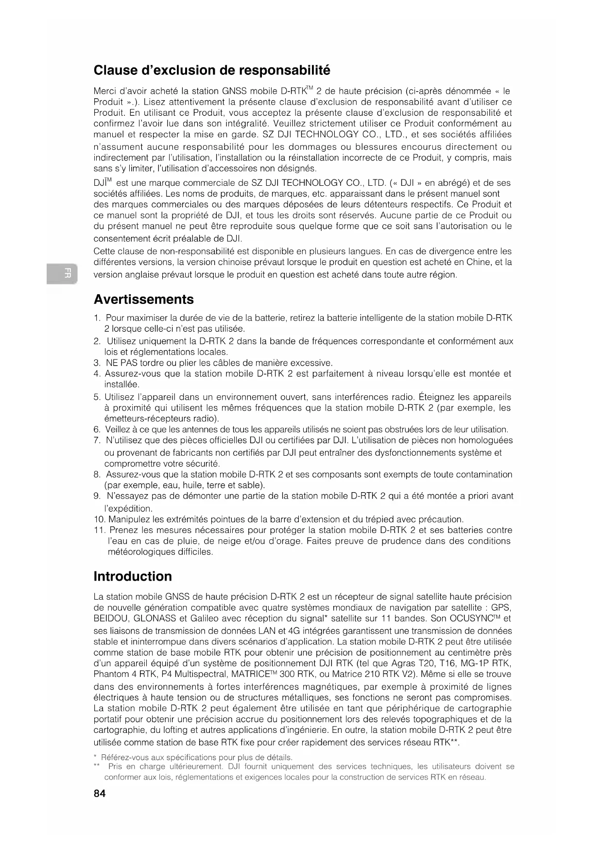 2 de haute précision (ci-après dénommée « le Produit ».). Lisez attentivement la présente clause d’exclusion de responsabilité avant d’utiliser ce Produit. En utilisant ce Produit, vous acceptez la présente clause d’exclusion de responsabilité et confirmez l’avoir lue dans son intégralité. Veuillez strictement utiliser ce Produit conformément au manuel et respecter la mise en garde. SZ DJI TECHNOLOGY CO., LTD., et ses sociétés affiliées n’assument aucune responsabilité pour les dommages ou blessures encourus directement ou indirectement par l’utilisation, l’installation ou la réinstallation incorrecte de ce Produit, y compris, mais sans s’y limiter, l’utilisation d’accessoires non désignés. DJI