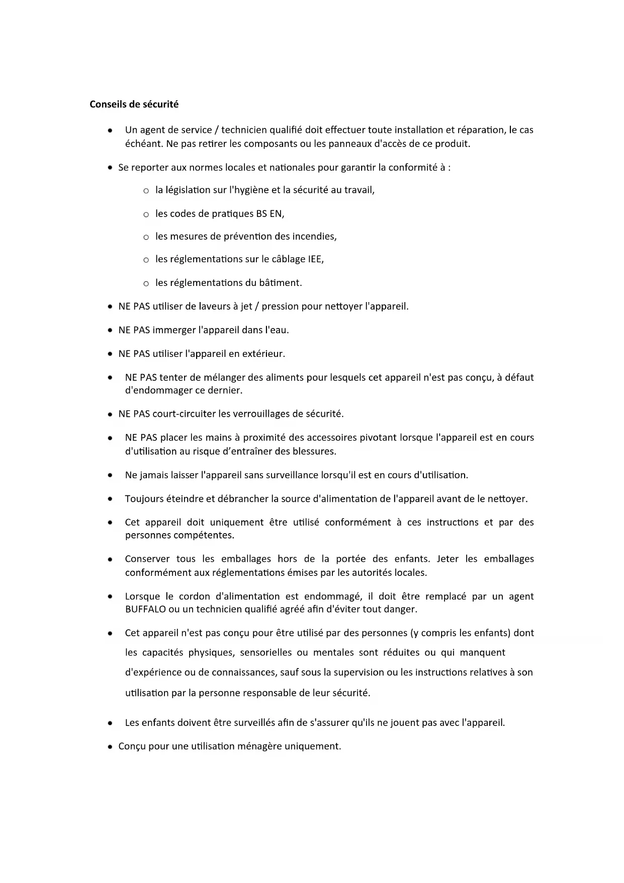 - Lorsque le cordon d'alimentation est endommagé, il doit être replacé par un agent BUFFALO ou un technicien qualifié/agree ASF d'éviter tout danger.