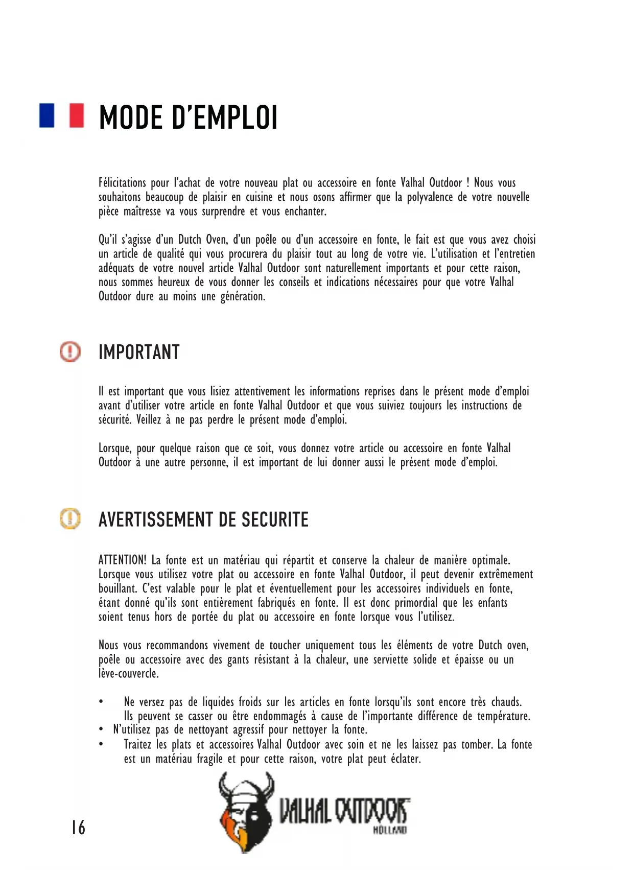 Il est important que vous lisiez attentivement les informations reprises dans le present mode d'emploi avant d'utiliser votre article en fonte Valhal Outdoor et que vous suiviez toujours les instructions de sécurité. Veillez à ne pas perdre le present mode d'emploi.