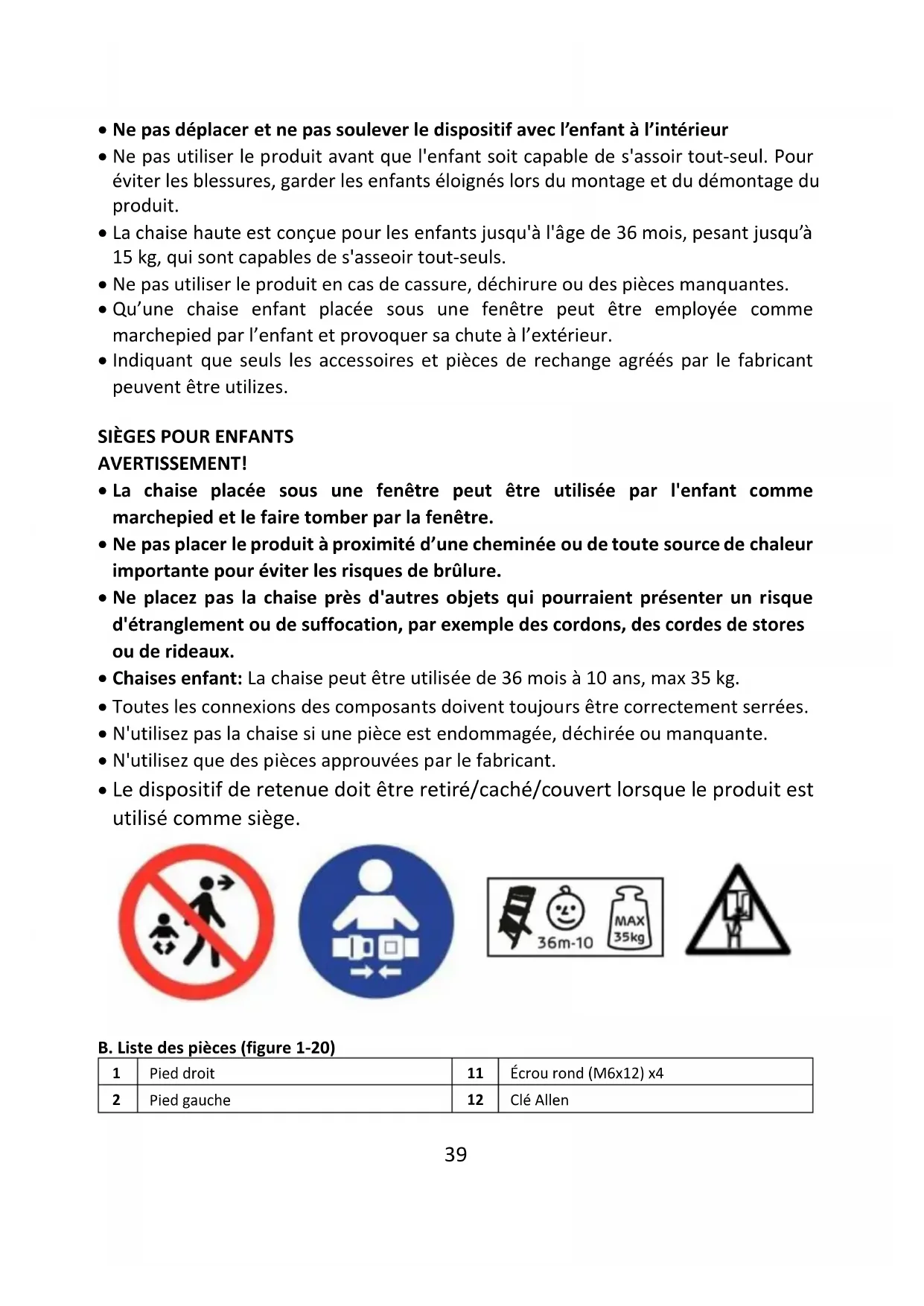 - Chaises enfant: La chaise peut être utilisé de 36 mois à 10 ans, max 35 kg.