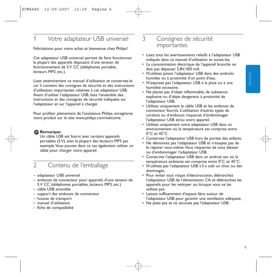 Votre adaptateur USB universel Félicitations pour votre achat et bienvenue chez Philips! Cet adaptateur USB universel permet de faire fonctionner la plupart des appareils disposant d’une tension de fonctionnement de 5 V CC (téléphones portable, lecteurs MP3, etc.). Lisez attentivement ce manuel d’utilisation et conservez-le car il contient des consignes de sécurité et des instructions d’utilisation importantes relatives à cet adaptateur USB. Avant d’utiliser l’adaptateur USB, lisez l’ensemble des instructions et des consignes de sécurité indiquées sur l’adaptateur et sur l’appareil à charger. Pour profiter pleinement de l’assistance Philips, enregistrez votre produit sur le site: www.philips.com/welcome. Remarque: Un câble USB est fourni avec certains appareils portables (5 V), avec la plupart des lecteurs MP3 par exemple.Vous pouvez dans ce cas également utiliser ce câble pour charger votre appareil.