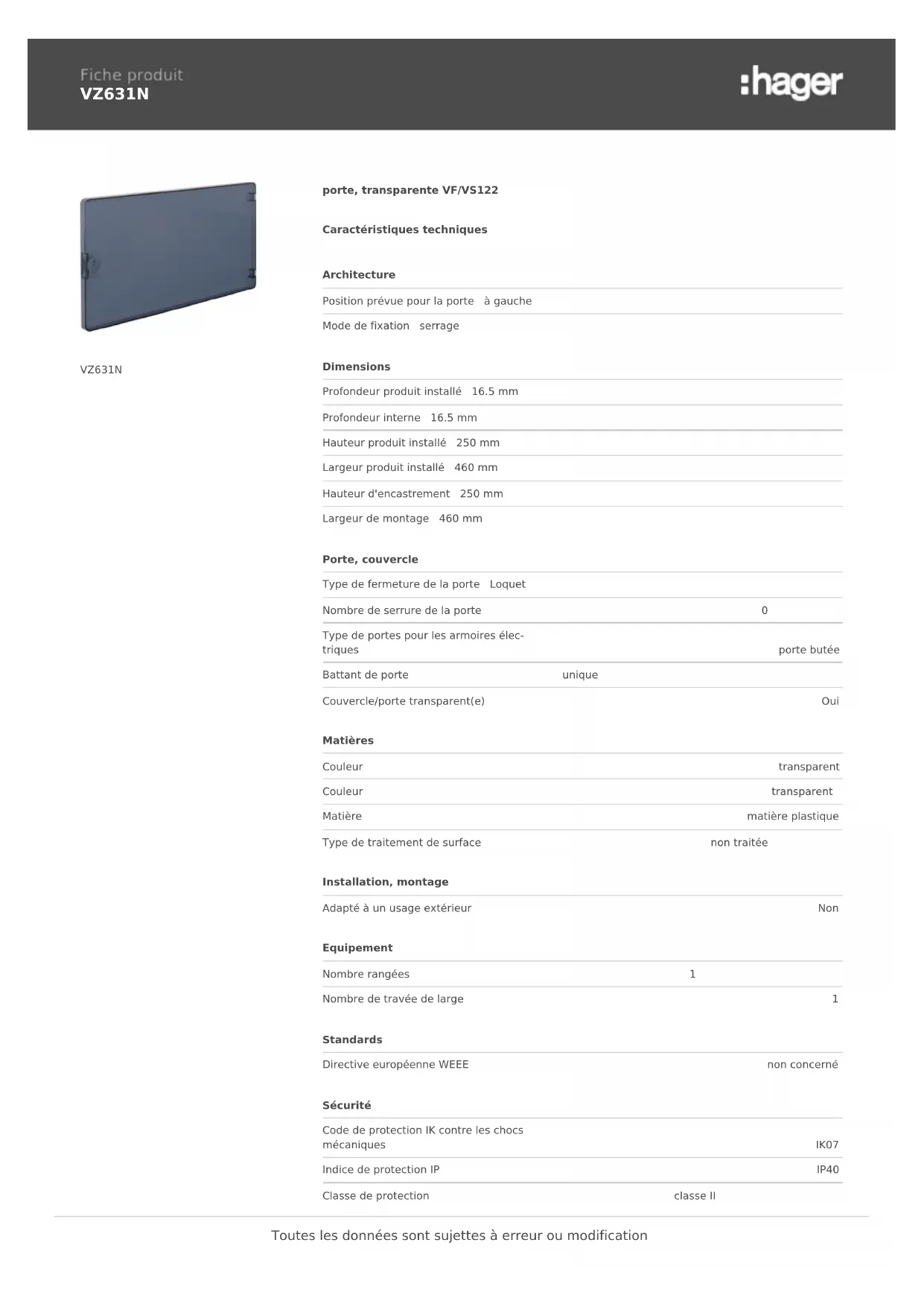 VZ631N VZ631N porte, transparente VF/VS122 Caractéristiques techniques Architecture Position prévue pour la porte à gauche Mode de fixation serrage Dimensions Profondeur produit installé 16.5 mm Profondeur interne 16.5 mm Hauteur produit installé 250 mm Largeur produit installé 460 mm Hauteur d'encastrement 250 mm Largeur de montage 460 mm Porte, couvercle Type de fermeture de la porte Loquet Nombre de serrure de la porte 0 Type de portes pour les armoires élec‐ triques porte butée Battant de porte unique Couvercle/porte transparent(e) Oui Matières Couleur transparent Couleur transparent Matière matière plastique Type de traitement de surface non traitée Installation, montage Adapté à un usage extérieur Non Equipement Nombre rangées 1 Nombre de travée de large 1 Standards Directive européenne WEEE non concerné Sécurité Code de protection IK contre les chocs mécaniques IK07 Indice de protection IP IP40 Classe de protection classe II Toutes les données sont sujettes à erreur ou modificationSans halogène Oui Conditions d'utilisation Température de service -25…40 °C Toutes les données sont sujettes à erreur ou modification